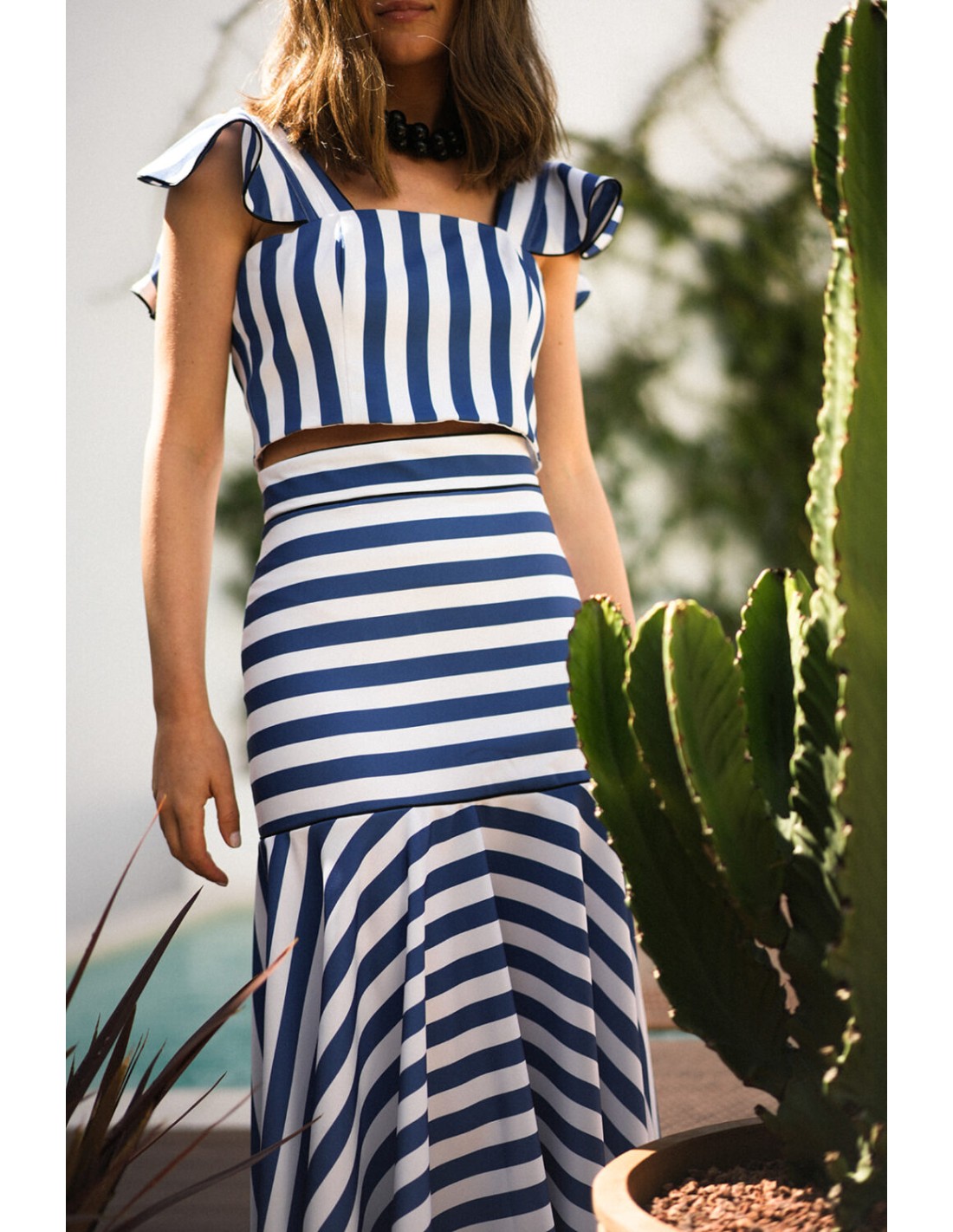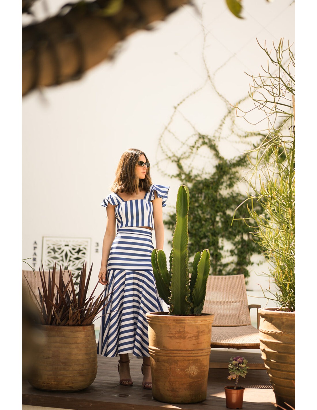 Stand out at your next event with our striped midi skirt with ruffle, a versatile and sophisticated garment ideal for guests looking for a fresh, elegant look with a different touch. Its striped design slims the figure, while the ruffle adds movement and femininity to every step.