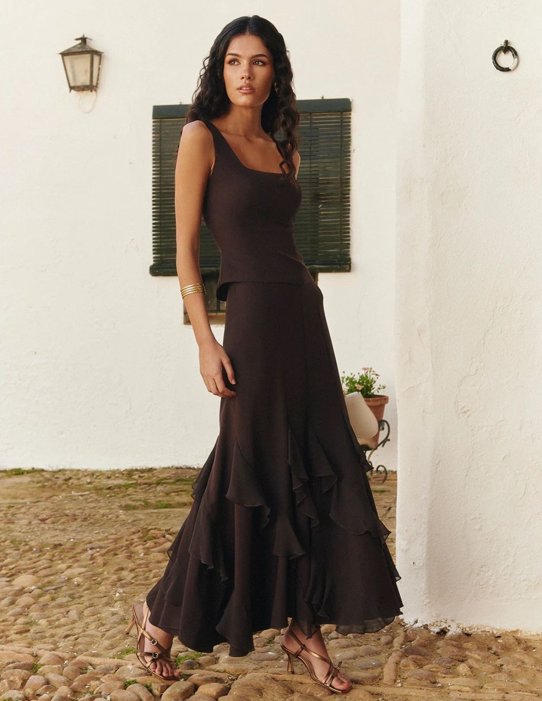 Brown high-waisted midi skirt with asymmetrical chiffon ruffles, elegant and flowing design ideal for events and special occasions.