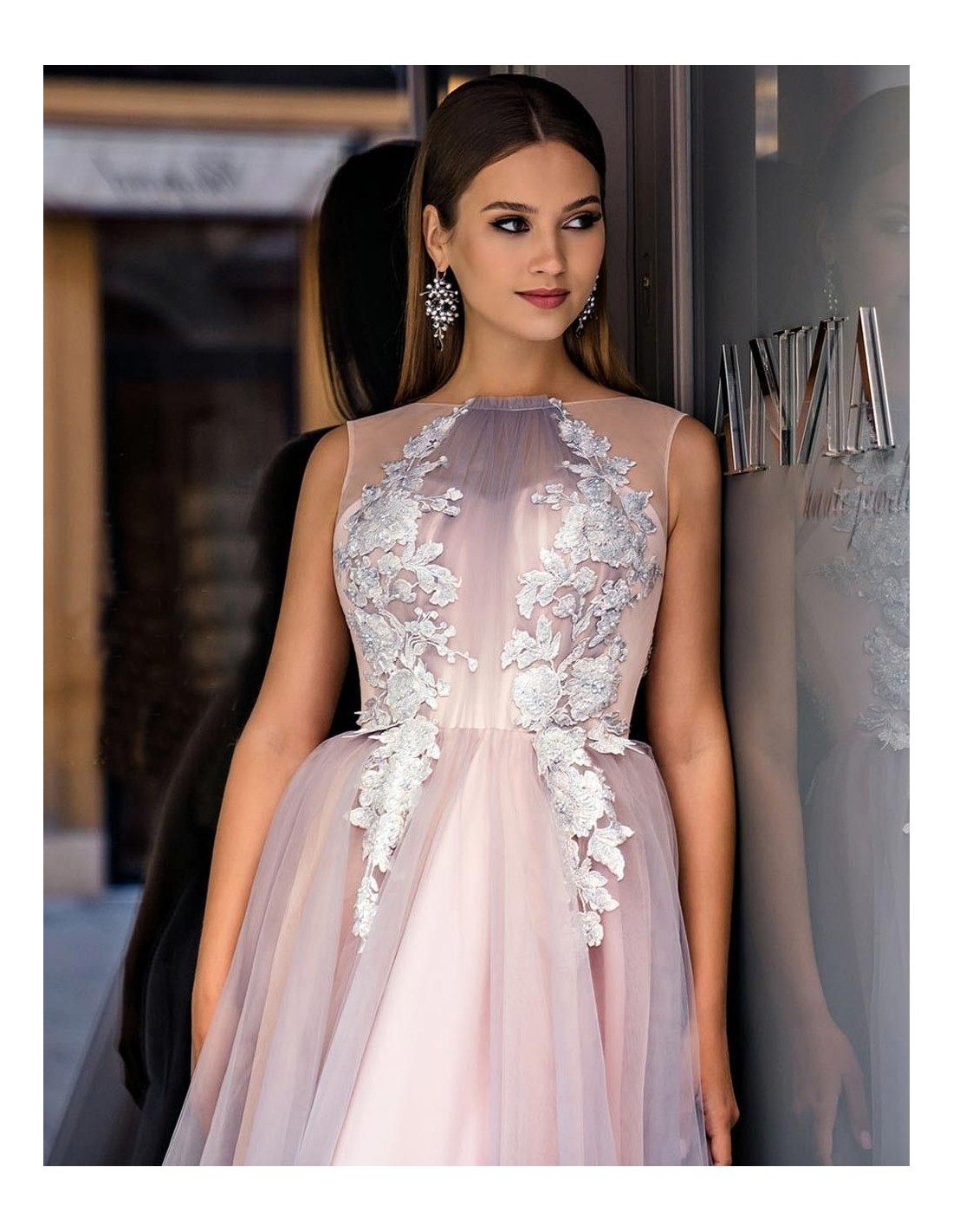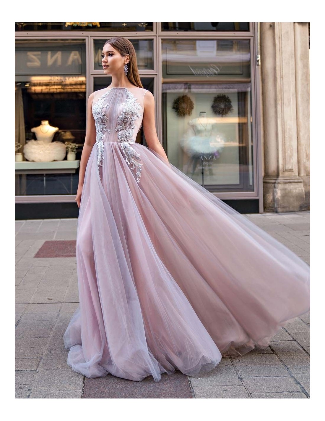 Elegant long tulle dress with embroidered bodice for special occasions.