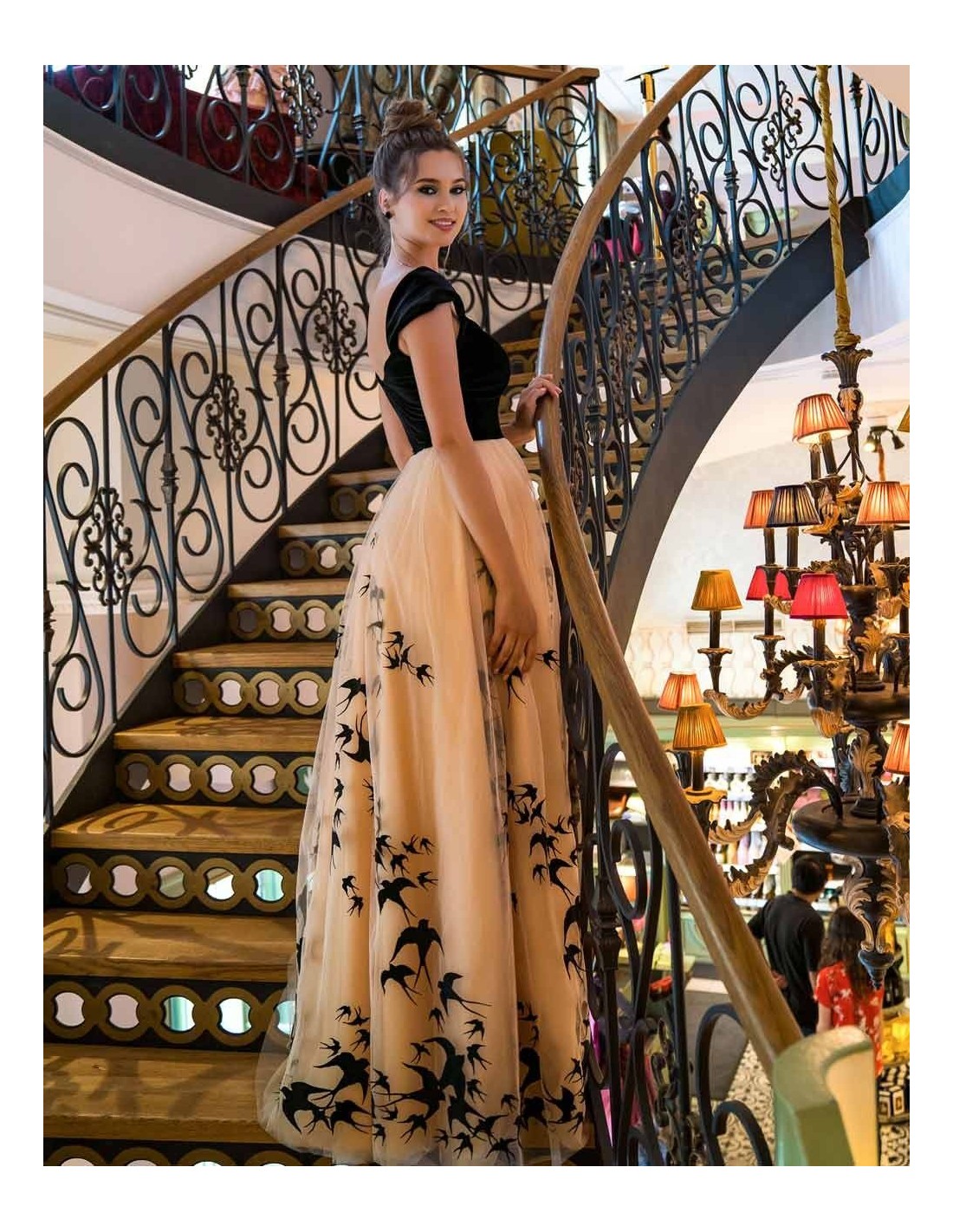This guest dress features a velvety black bodice with an open-shaped neckline and short sleeves. Its voluminous cream tulle layered skirt is embellished with embroidered birds to make it even more special. It closes at the back with an invisible zip.