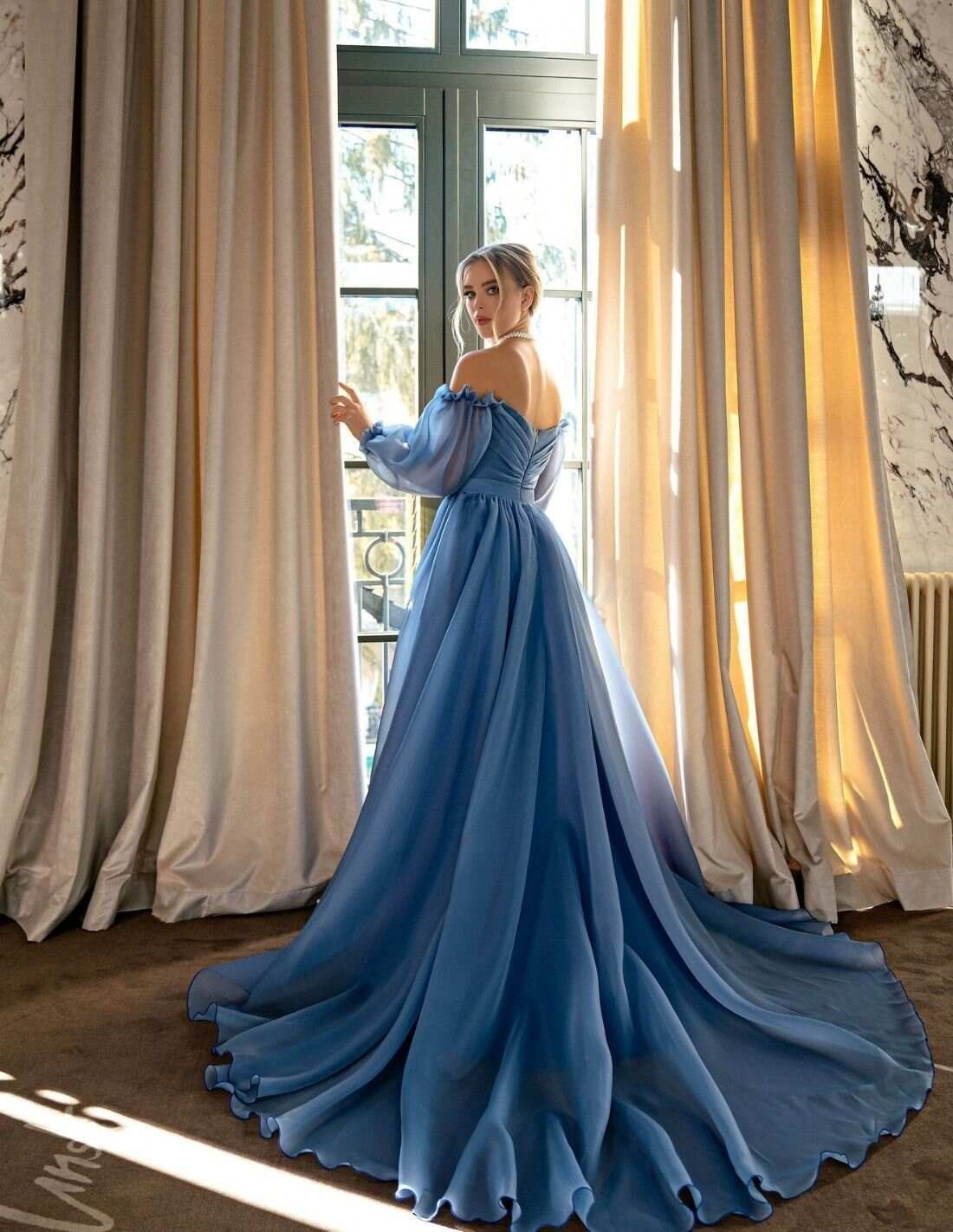 This guest dress is presented in crepe with tulle combined on the sleeves available in nude or blue. The design features a scooped neckline with an integrated bodice for comfort and cups with ruching. The puffed sleeves with a small pucker at both ends make this design a unique and very special garment.