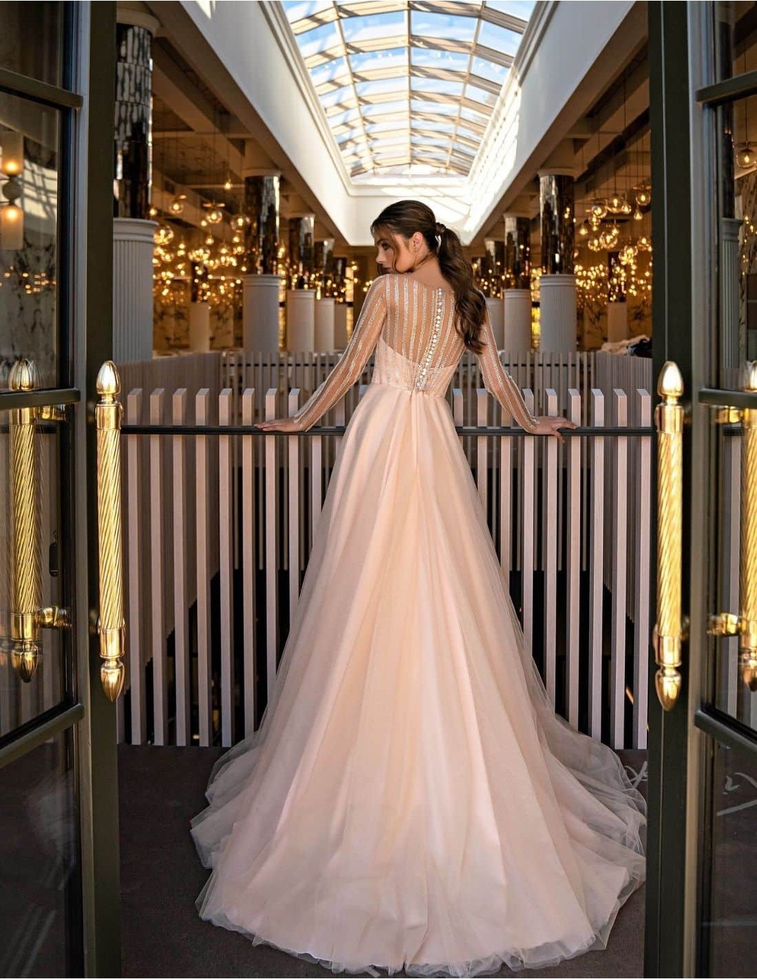 This wedding dress for guests is presented in champagne-colored crepe and tulle. It features a strapless neckline with a tattoo effect rhinestone encrusted bodice and long sleeves. The skirt is made up of layers of tulle with tulle lining.