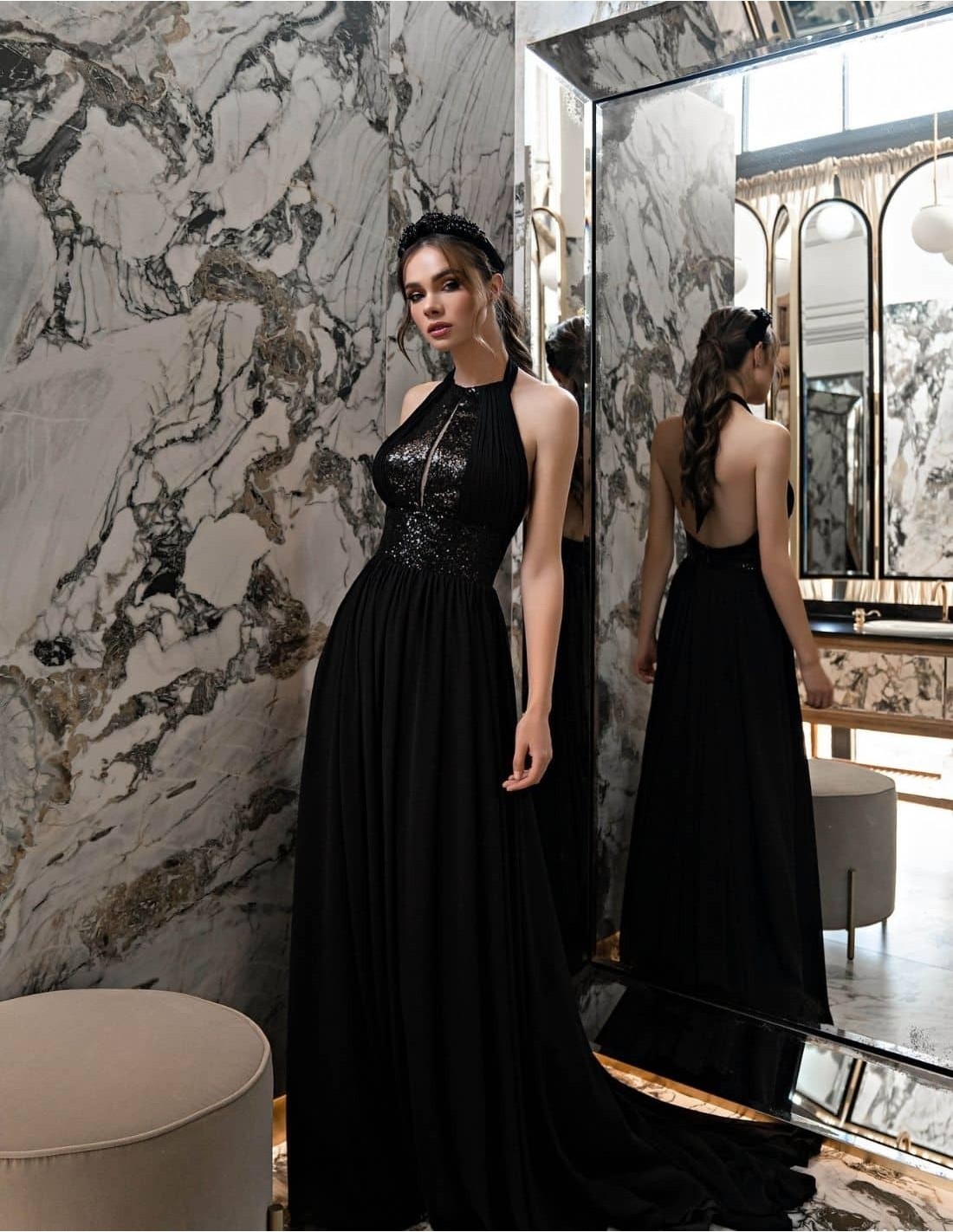 Radiant halter neckline party dress pleated with sequins. With an open back, this spectacular dress has a long skirt finished with a train.