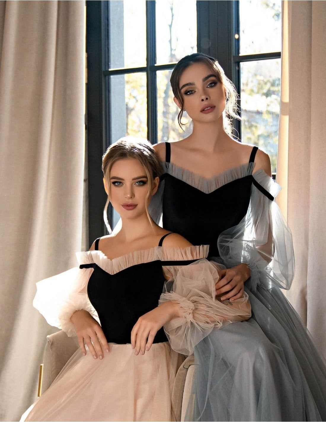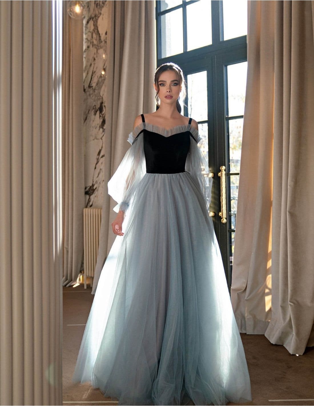 Spectacular tulle dress with bishop sleeves and a plunging neckline for special occasions.