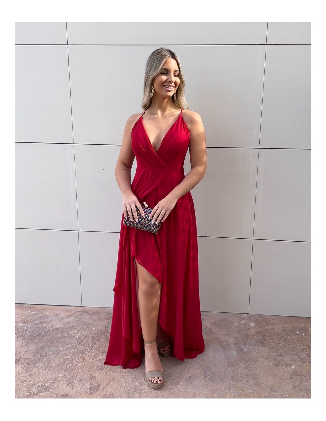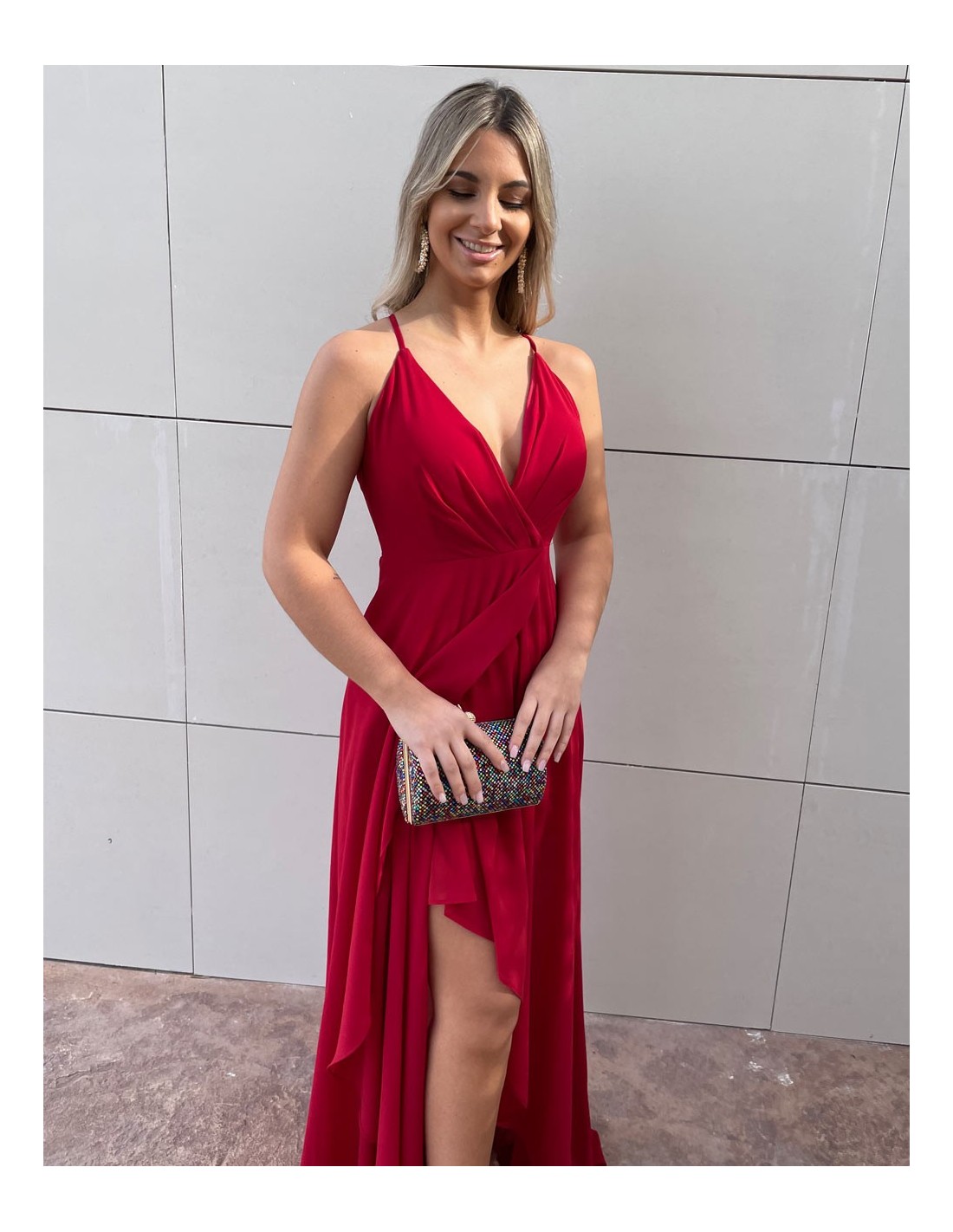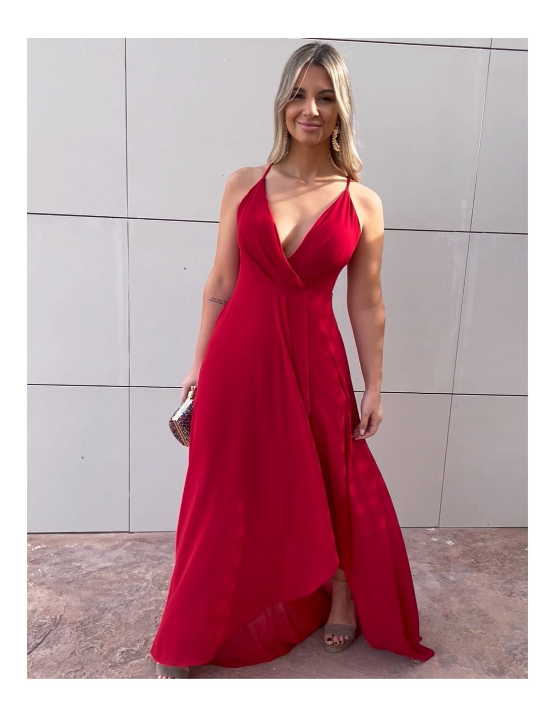 Maxi dress with a deep V-neckline in cherry red.