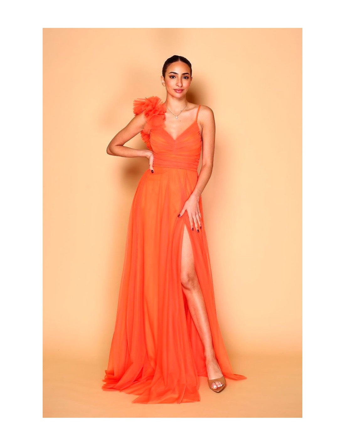 The detail on the right shoulder is ideal and gives it an elegant and romantic touch that you will love. The empire cut of the chest, will enhance your figure and is complemented by an infinite opening in the skirt. No doubt this tulle evening dress will not go unnoticed.