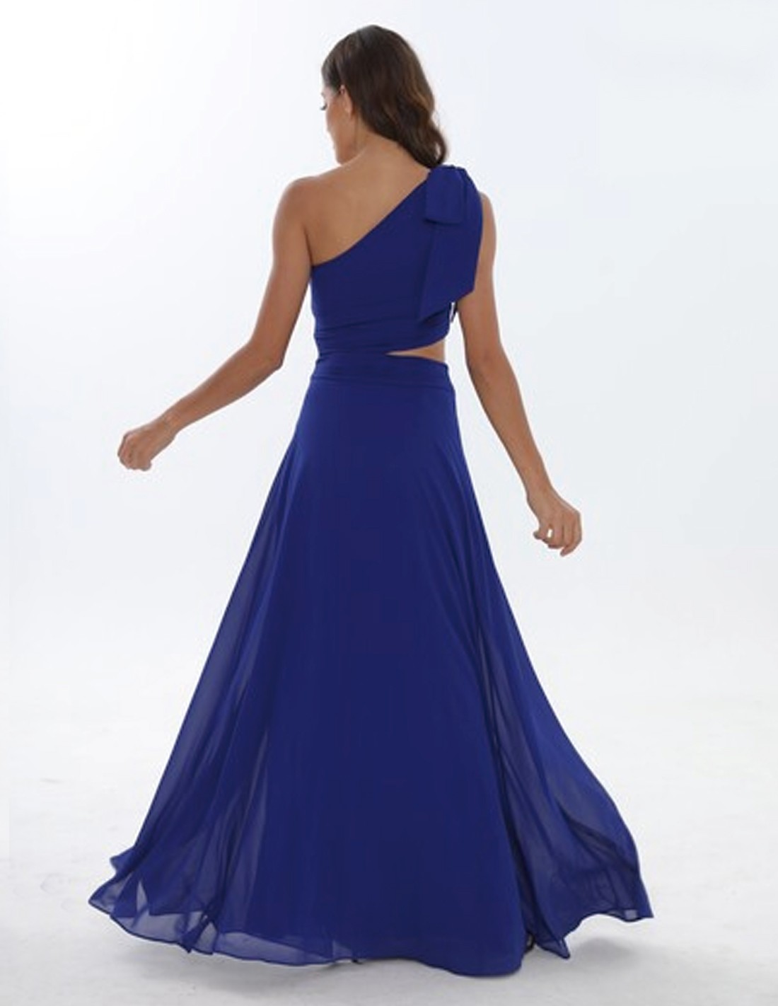 Evening dress with side cut-out and asymmetric bow neckline