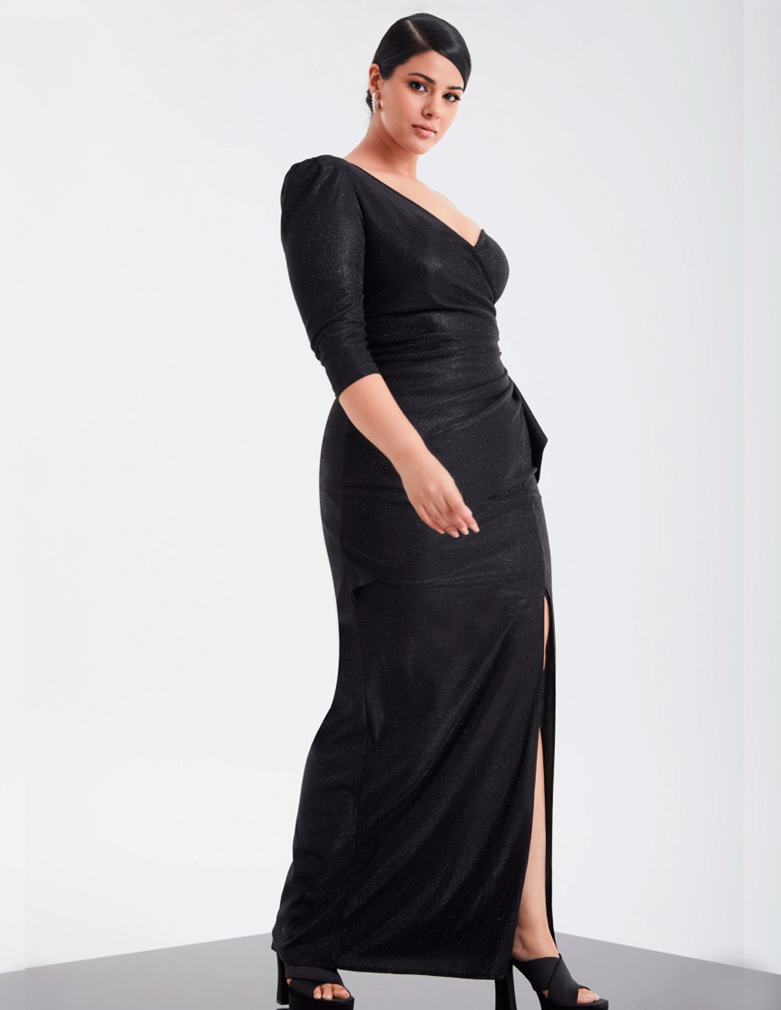 Long party dress with sparkles and asymmetrical neckline for guests who want to dazzle.