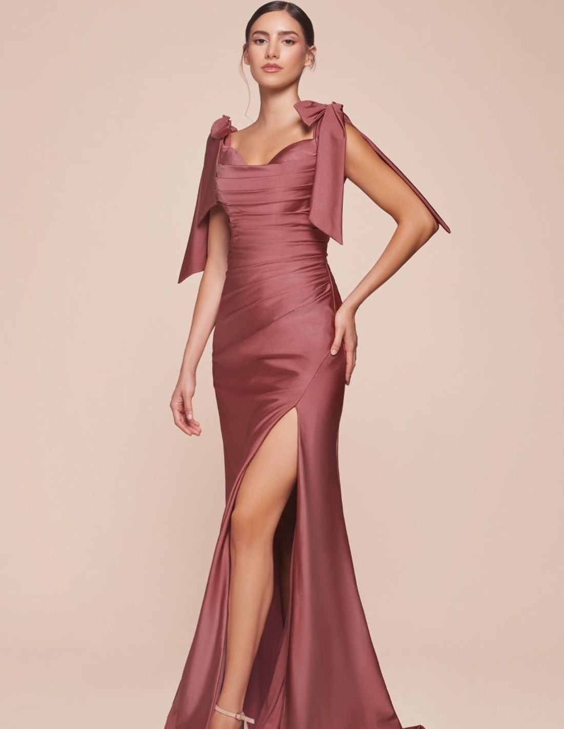 - Satin gown with spaghetti straps