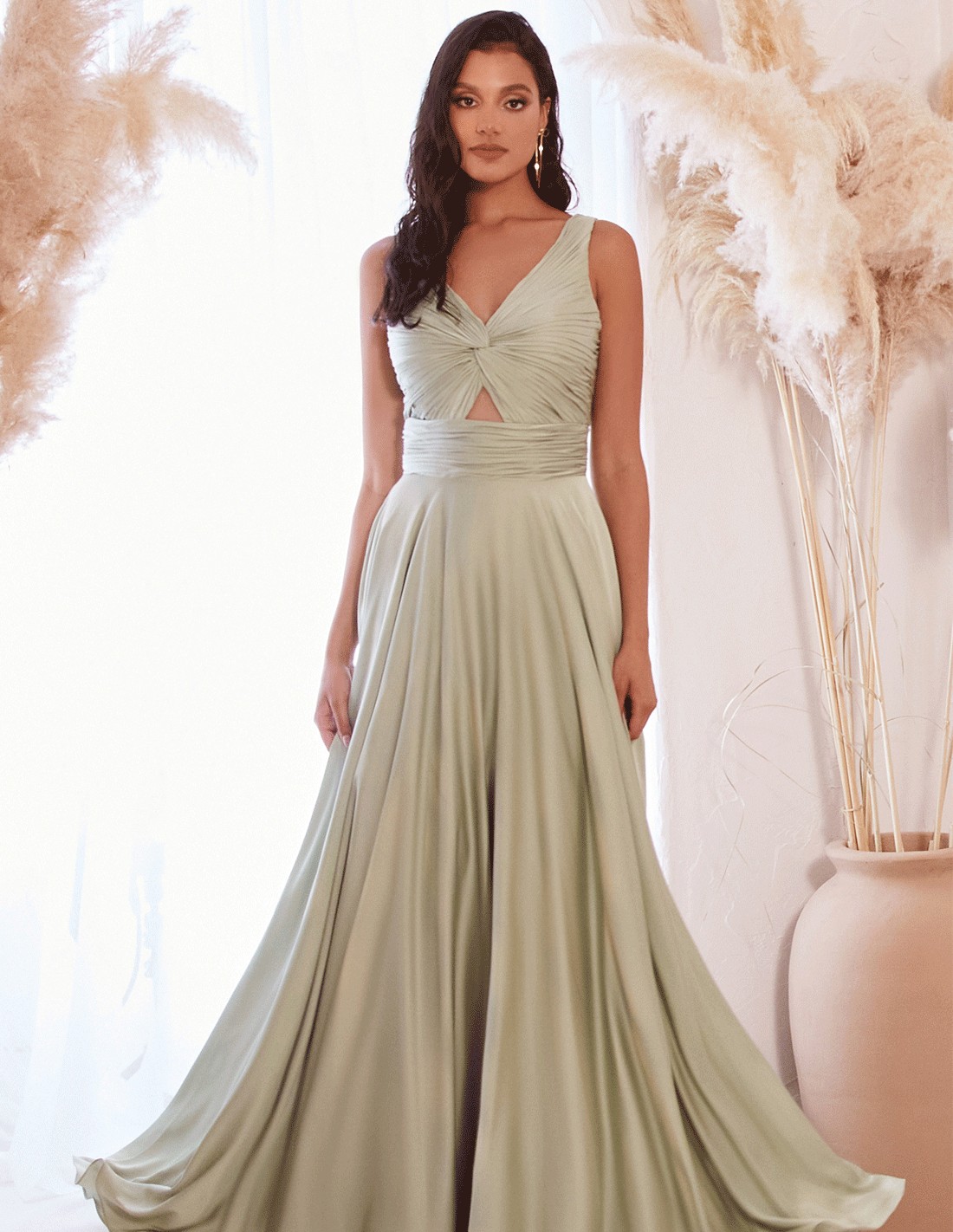 Elevate your style with this Long satin gown with draped strapless neckline, perfect for special occasions such as evening weddings, gala dinners or as guest styling for the sister and bridesmaids of the bride and groom.