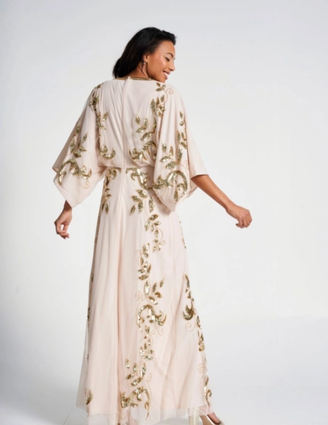 Long party dress with golden sequin leaves for guests, bridesmaids and special events.