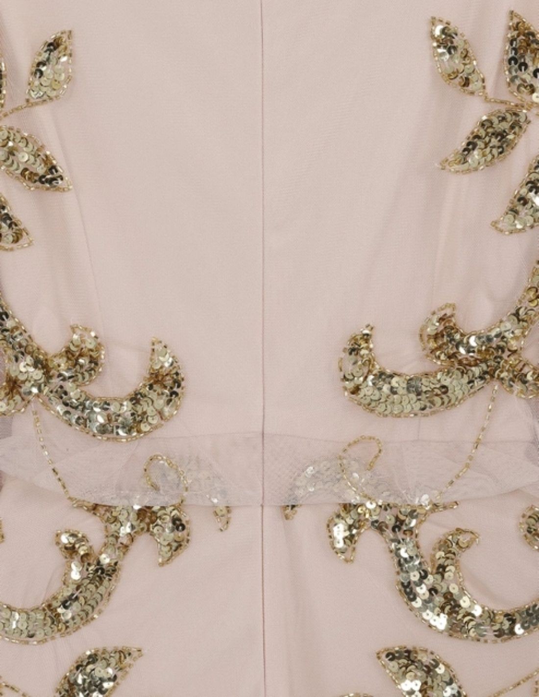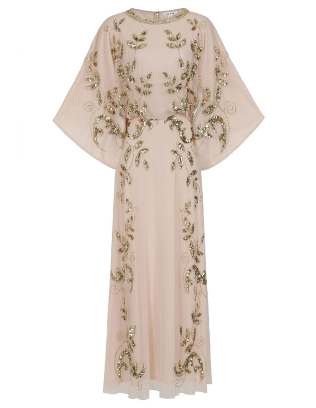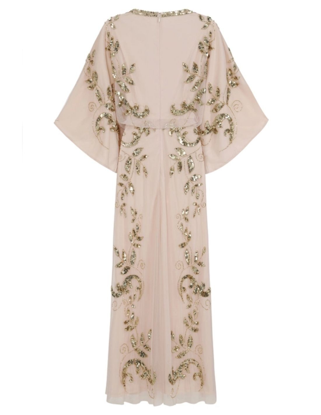 This spectacular guest tunic dress is made in a nude-coloured crepe base combined with chiffon adorned with leaf-shaped motifs sewn in gold sequins.