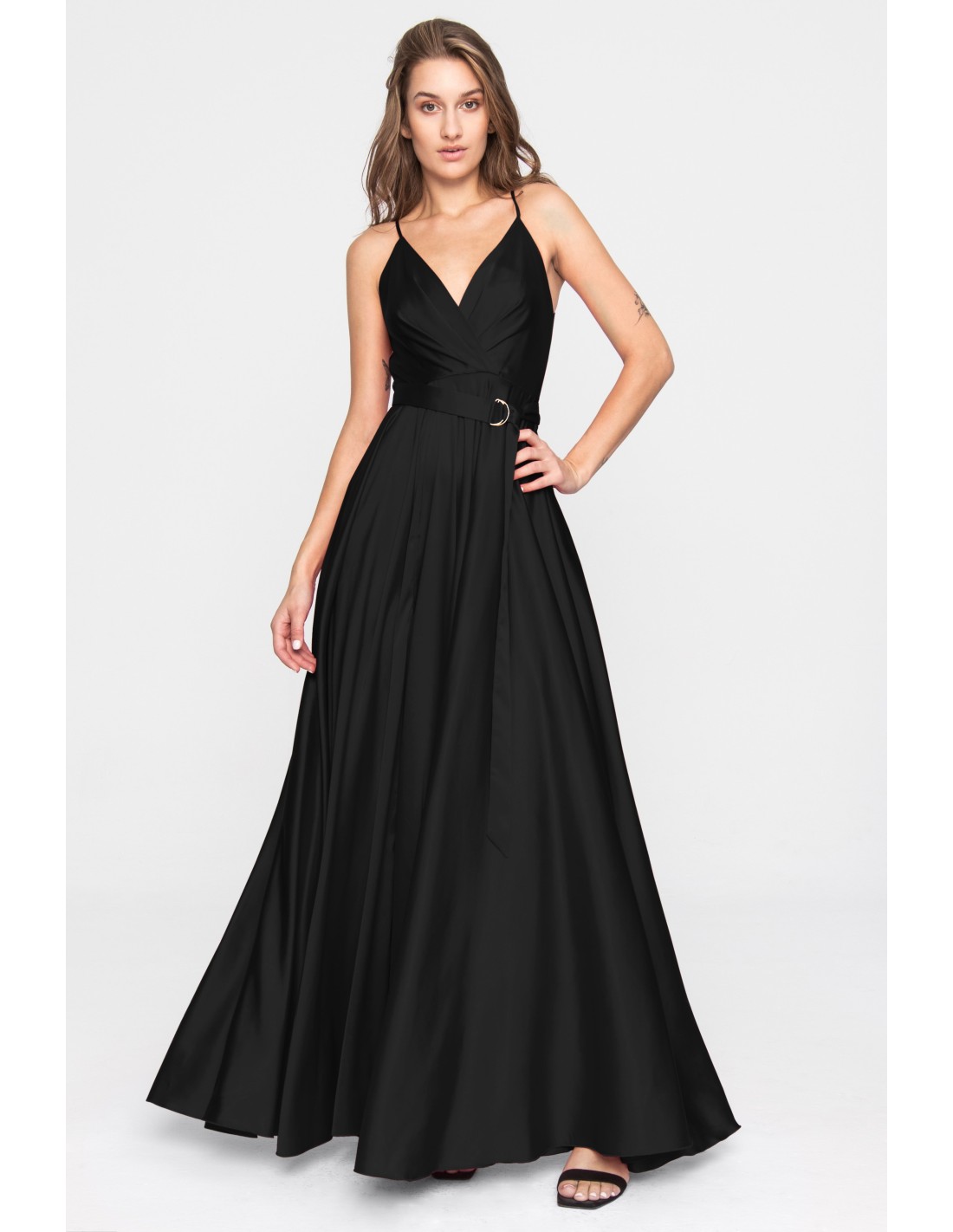 This event dress is made in a very flattering black satin fabric for evening events. It features a fitted silhouette that will enhance your figure, a V-neckline with adjustable straps and a long skirt with a side slit. Invisible zip fastening at the back. Includes belt with buckle.