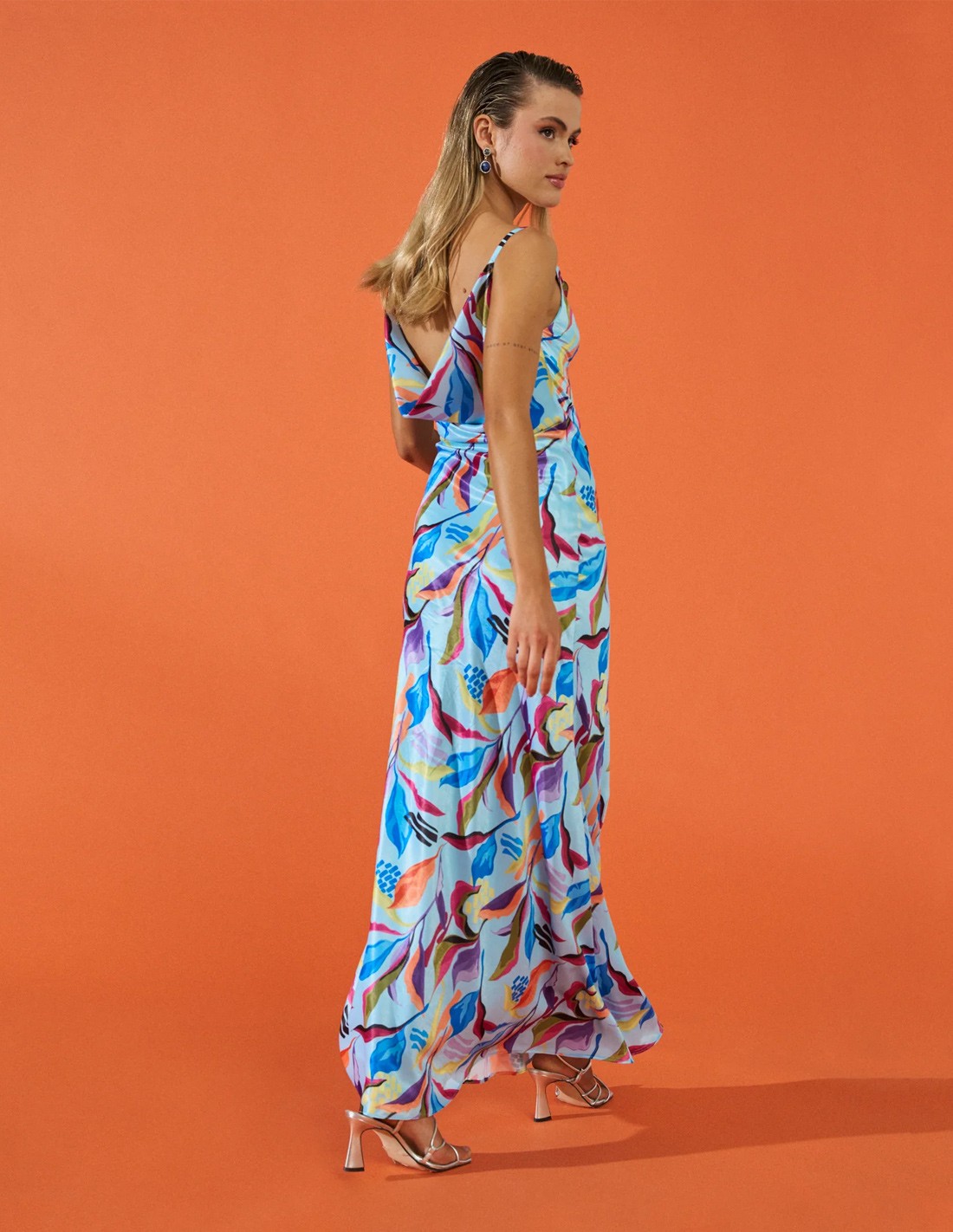 A very special look for this season, perfect for prom or evening guest. An original and flattering design that you will want to wear on your most special occasions. Made with fluid satin crepe, very comfortable to wear in summer. It also has a colourful print perfect to combine with all kinds of accessories. Made with thin straps and cascading back.