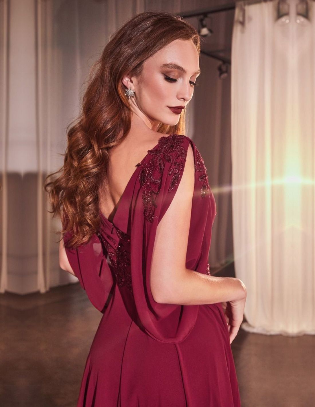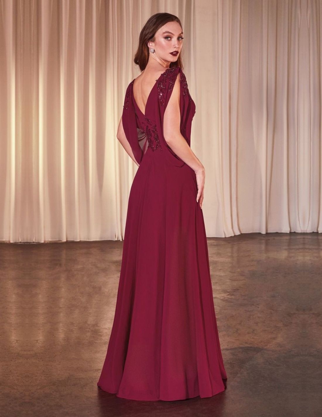 Long chiffon guest dress with open sleeves and rhinestone details
