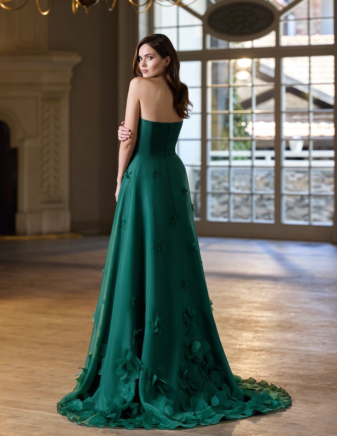 How ideal is this long dress for guest with 3D flower detail. The design is strapless and you can put on or remove the bolero according to your taste or the type of event, as it is removable and also handmade with 3D flowers like the skirt. The draped corset at the waist enhances the silhouette. It incorporates a back zipper with inner drawstring for a comfortable fit. The skirt can be made in two versions, long and short. You can choose between pink, green or black.