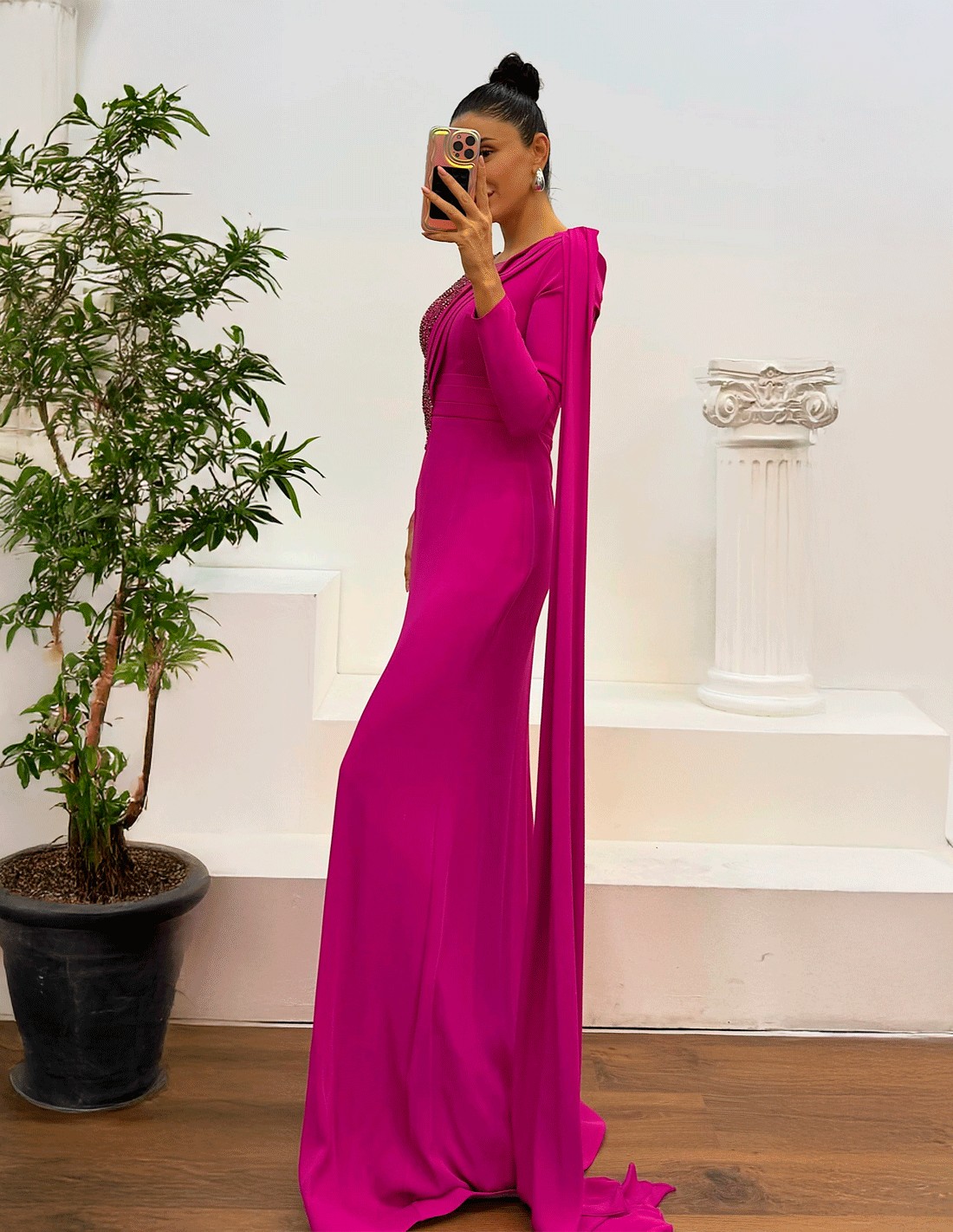 Look spectacular at your next event with this long ball gown with rhinestones, an exclusive design designed for bridesmaids, sisters of the bride or groom, or any special guest who wants to stand out for its elegance. Its bodice adorned with sparkling rhinestone details and elegant long sleeves make this dress a sophisticated and timeless choice for evening weddings, galas or formal celebrations.