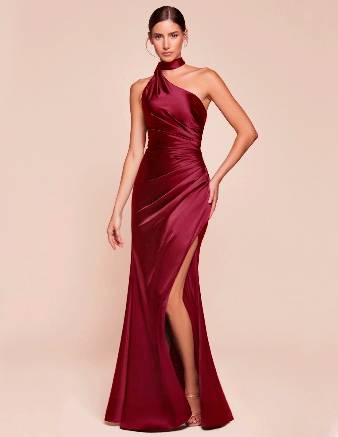 This stunning long party dress is perfect for any guest who wants to dazzle on a special occasion. Crafted from luxurious satin, the design features an elegant one-shoulder halter neckline and a figure-skimming gathered waist. The leg slit adds a modern and attractive touch, while the center back zipper ensures a flawless finish. This dress is ideal for both bridesmaids and guests at weddings, galas or formal events.