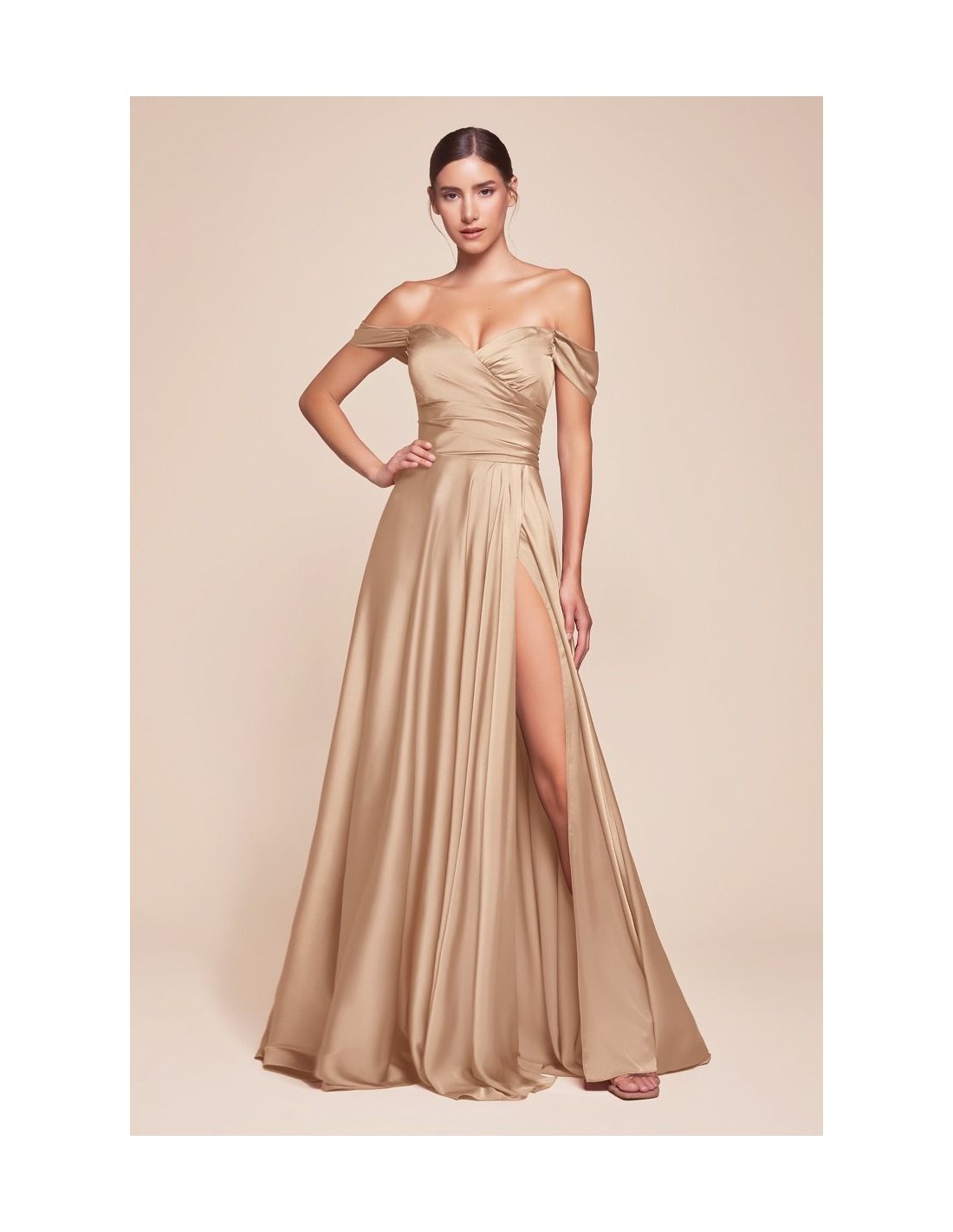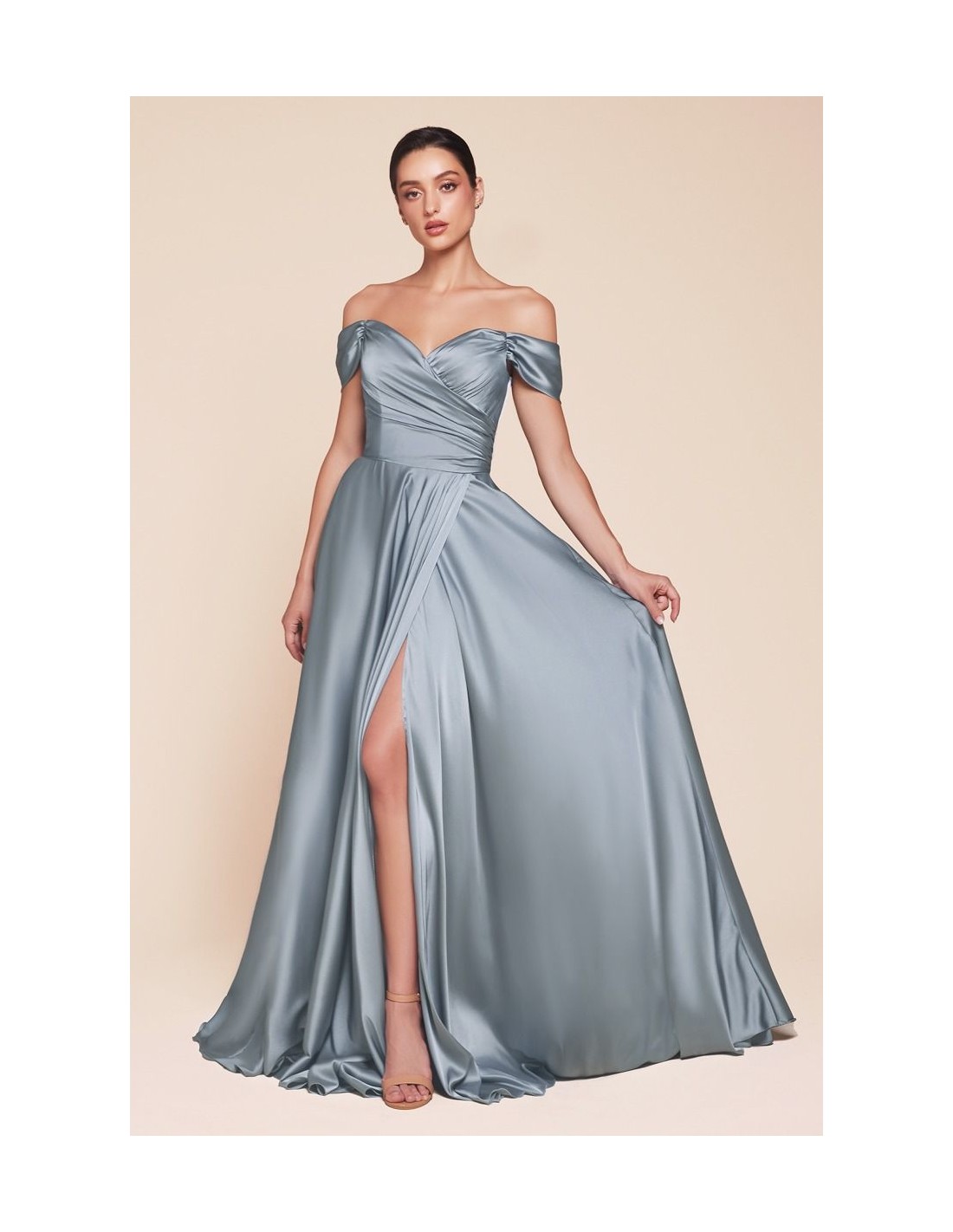 Discover this elegant satin sweetheart neckline ball gown, designed to highlight your style and sophistication. The A-line silhouette combines comfort and femininity, while the off-the-shoulder sleeves add a romantic and modern touch. The fitted bodice enhances the figure, and the slit skirt provides freedom of movement and an impeccable finish.