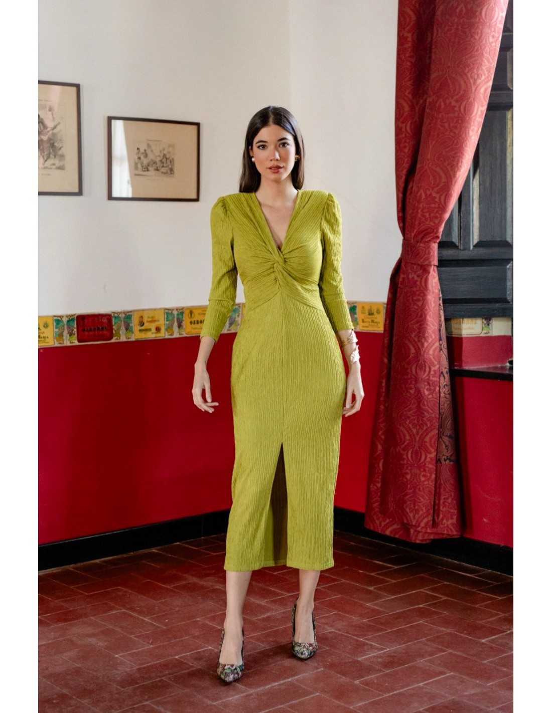 This elegant pistachio green long dress is a sophisticated and feminine piece, designed to highlight the beauty of the wearer. With a draped neckline that adds a touch of glamour, its fluid and lightweight construction ensures comfort without sacrificing style. Ideal for formal events or special celebrations, this dress offers an elegant silhouette that flatters the figure, while the pistachio green hue gives it a fresh and modern feel. Perfect for those looking to stand out with a refined and original look.