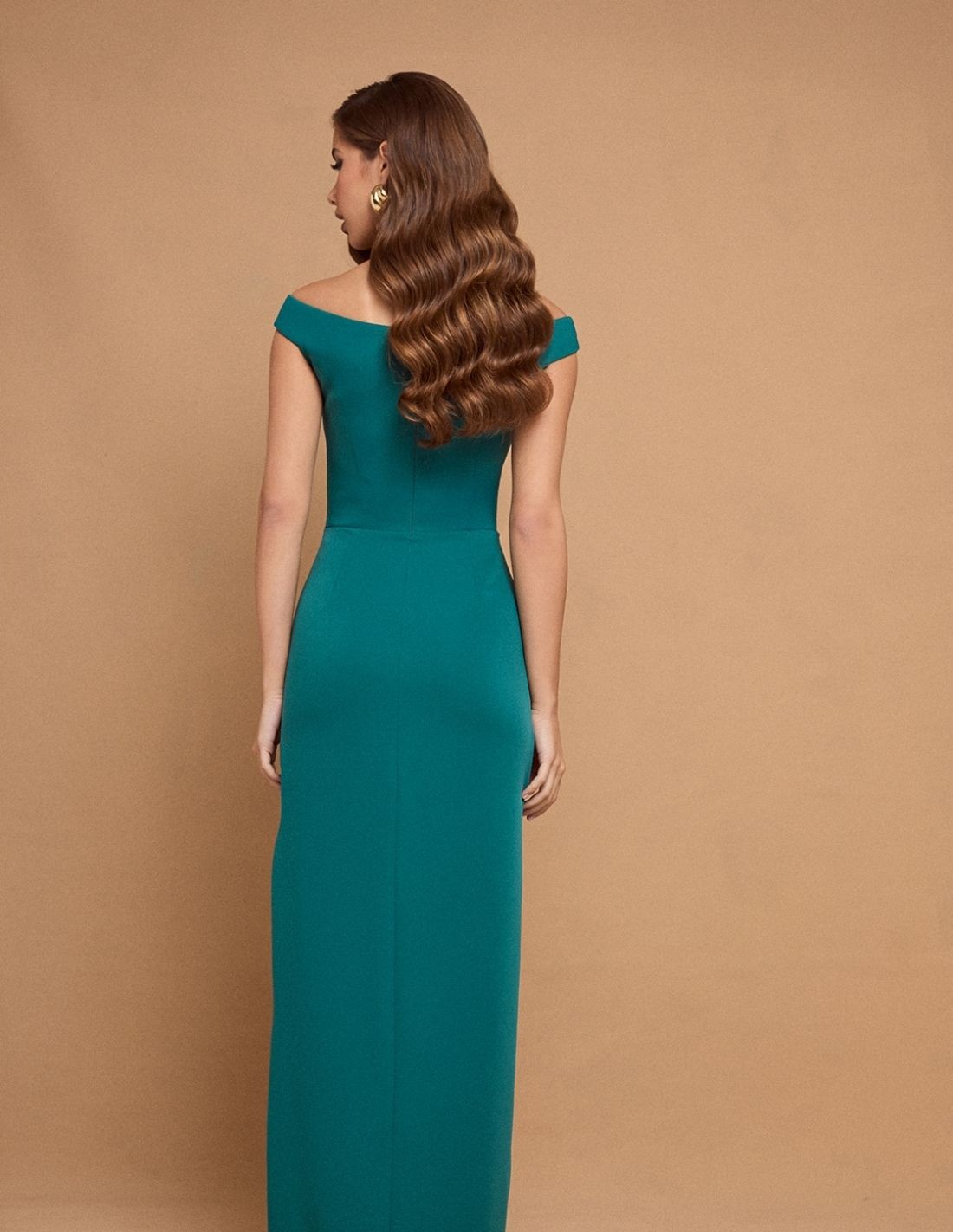 Emerald green bandeau necklinelong dress for special events. This minimalist wedding guest dress is the ideal choice for those who value understated elegance and premium quality. Crafted from high quality crepe with a touch of elastane, it offers an impeccable fit that highlights the figure.