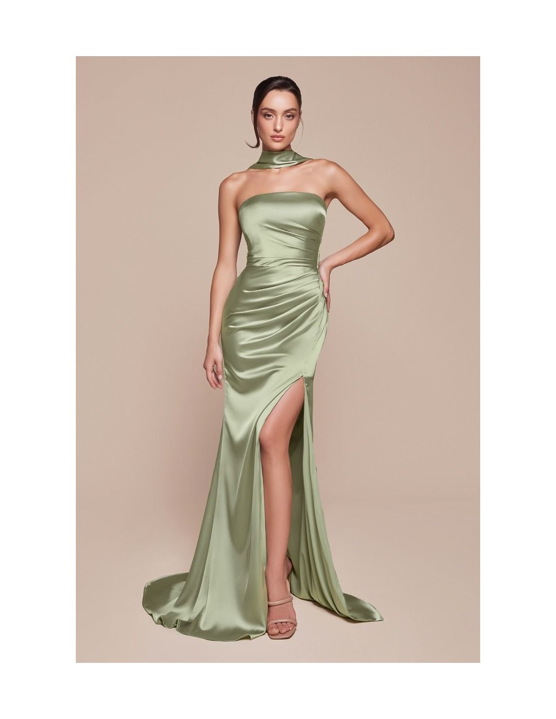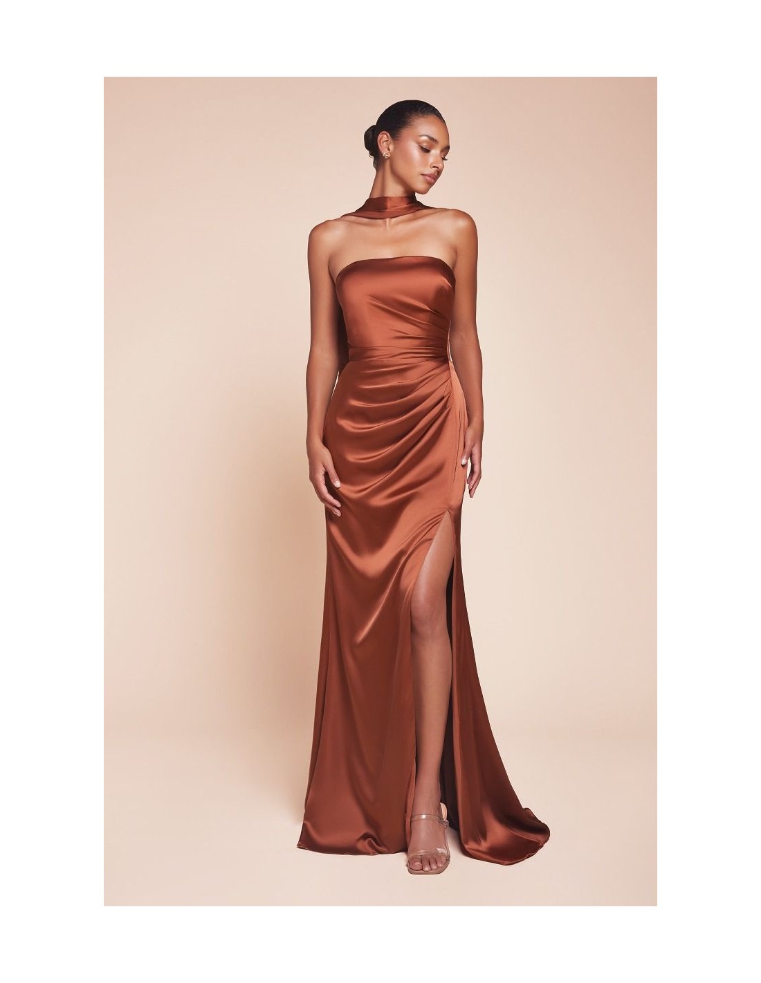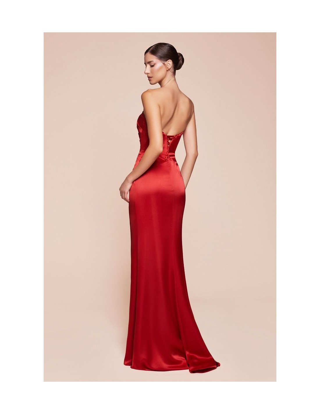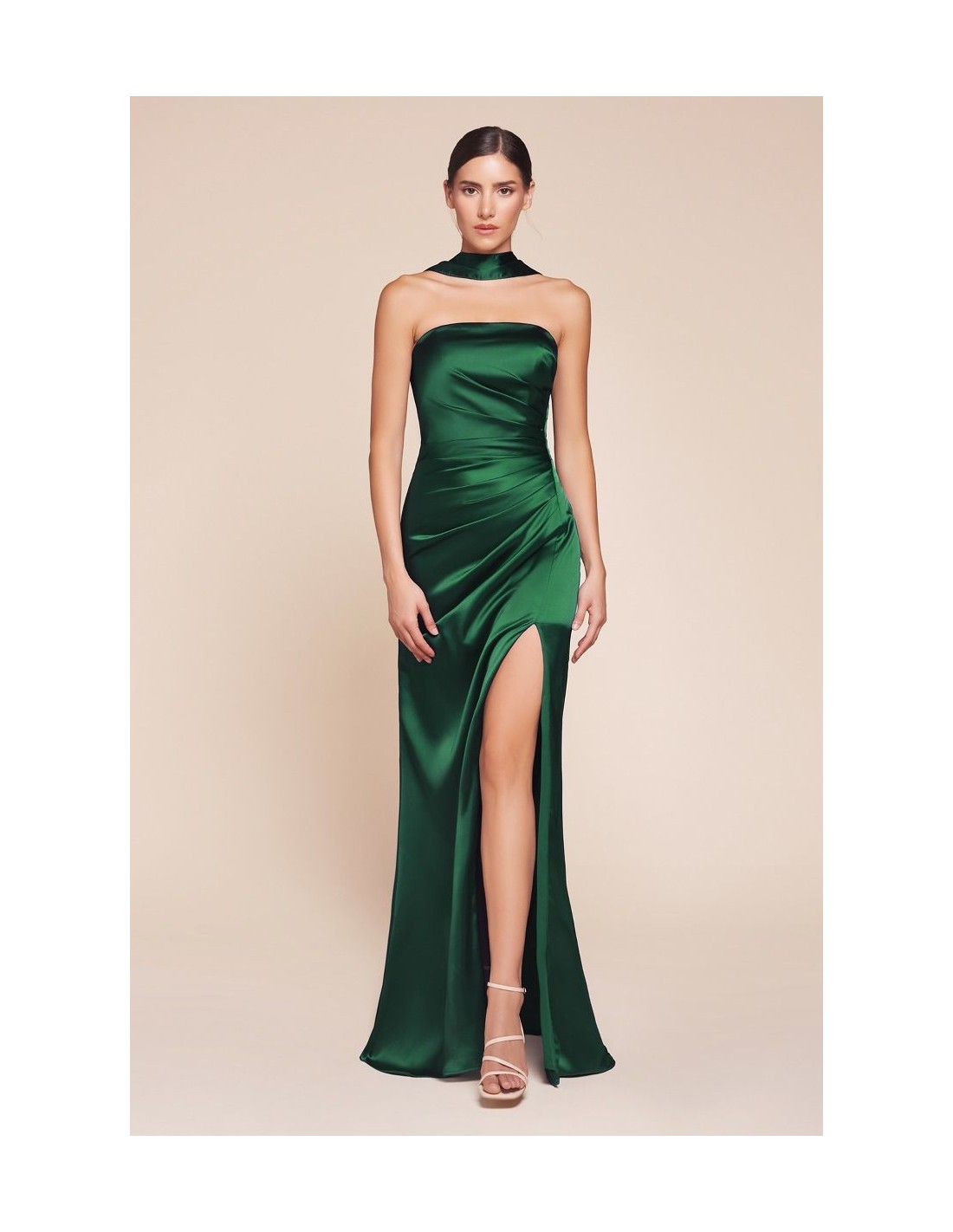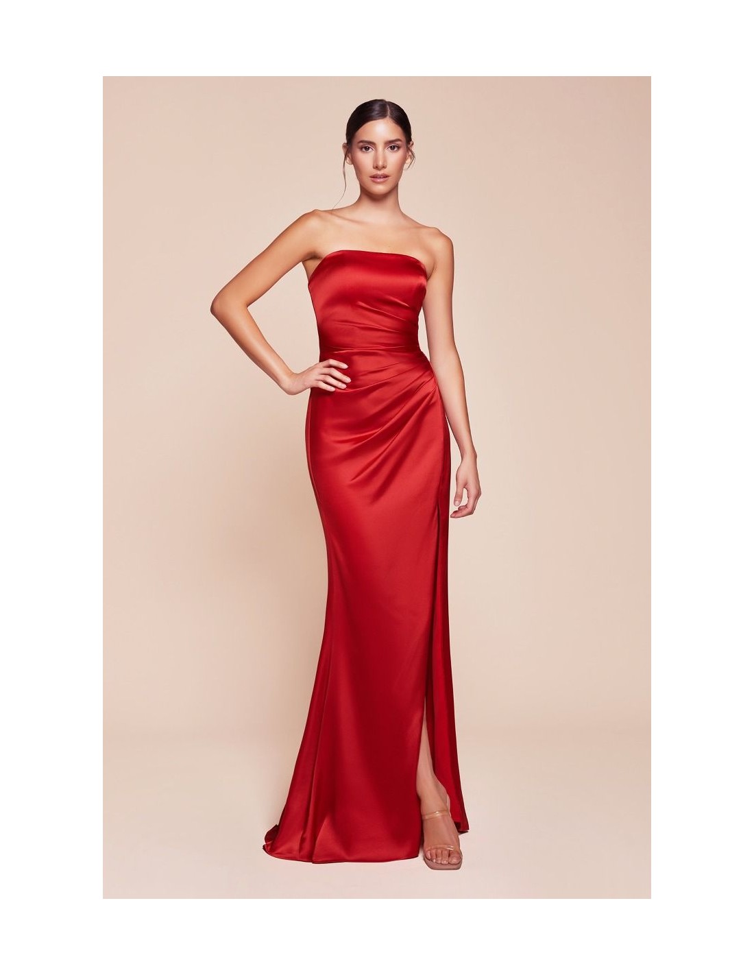 Look radiant at your next event in this long straight strapless guest dress, an elegant and sophisticated choice for weddings and special occasions. Its design includes a slit in the skirt, which adds a touch of sensuality and movement, and a subtle train for a more refined finish.