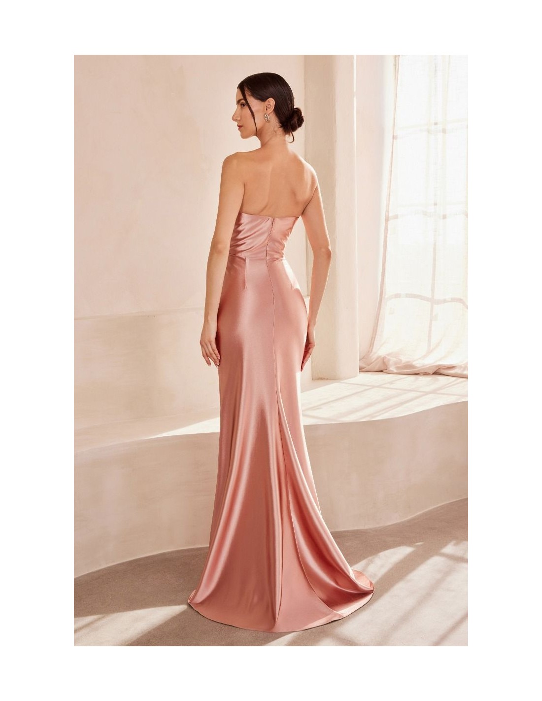 Dazzle in this strapless floor length guest dress with an elegant satin sweetheart neckline. Its draped design enhances the feminine figure, providing a flattering and sophisticated fit. In addition, the large slit in the skirt adds a touch of sensuality and movement, perfect to look stylish at any celebration.