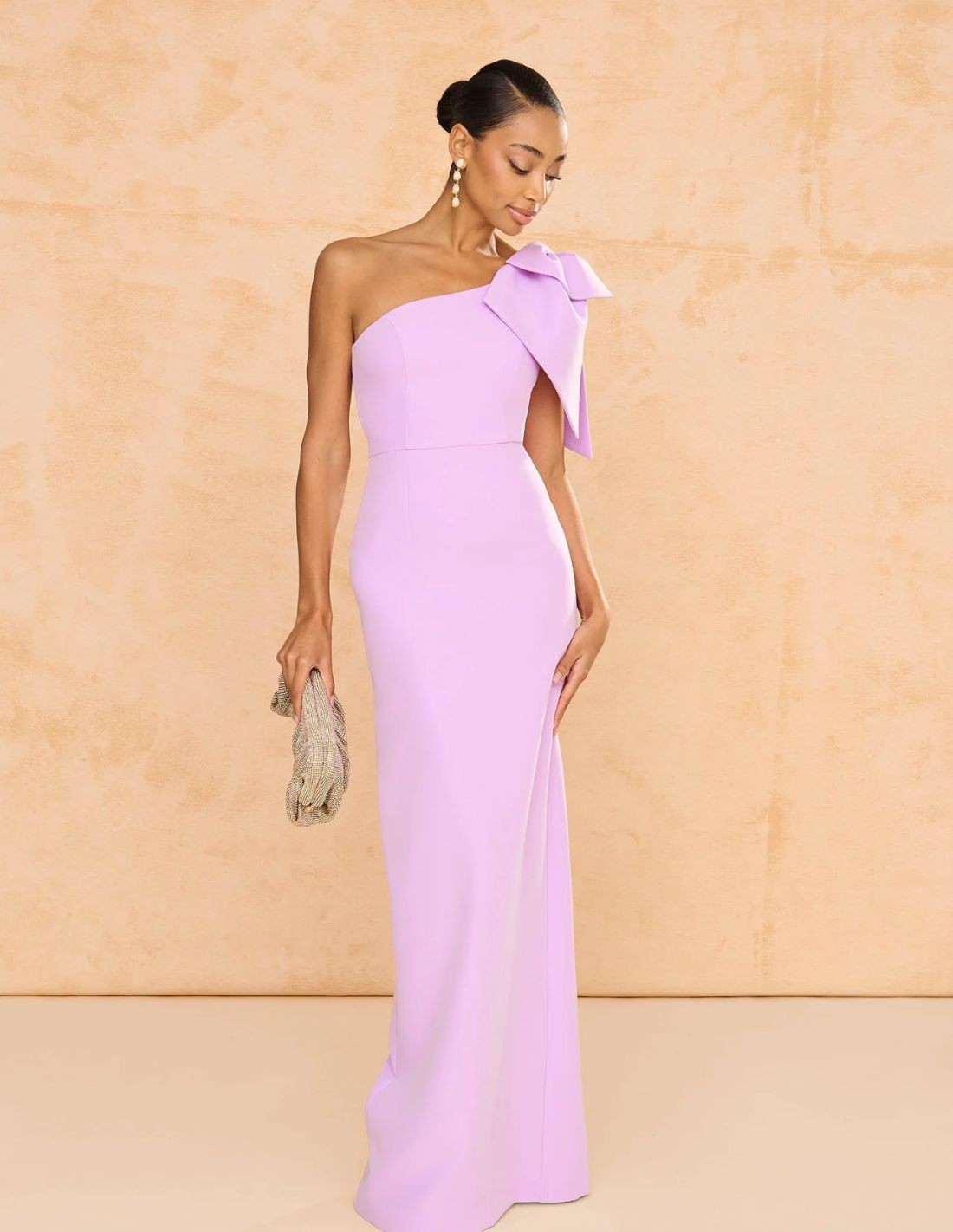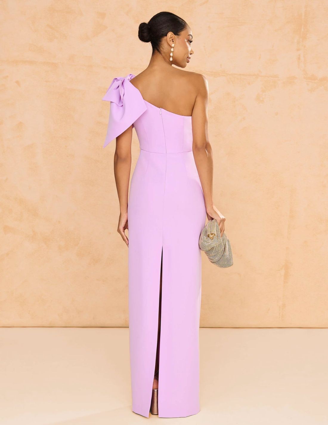 This long guest dress is perfect if you are a special guest, sister of the bride or groom or even a bridesmaid. A very special and feminine design, with asymmetrical neckline and maxi bow on one of the shoulders. Its lilac color is ideal for this spring season and also easy to combine. Made in crepe, comfortable and flattering with an opening in the back, we love it for evening weddings!