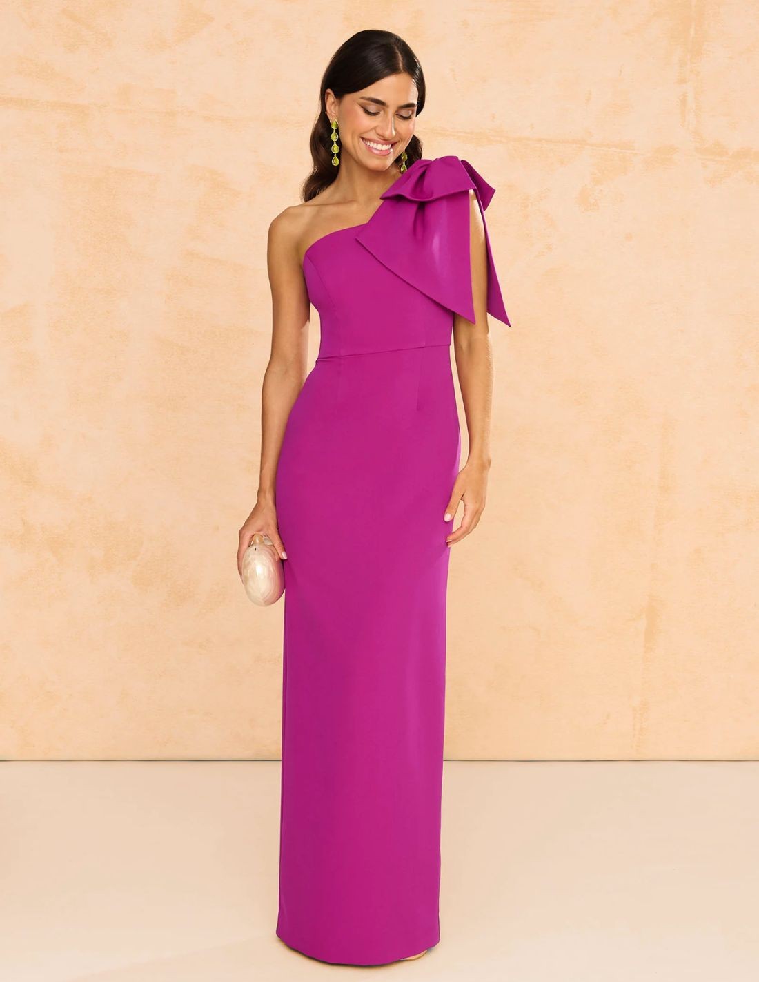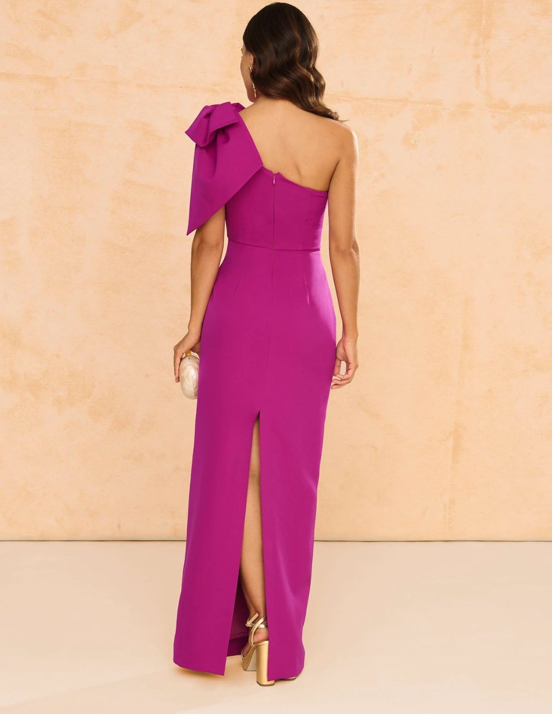 This long bougainvillea party dress is a beautiful design perfect for sister of the bride or groom, bridesmaid or special guest. Made in crepe with asymmetrical neckline, with a maxi bow on one shoulder and a sheath skirt. Flattering and elegant to shine at events such as weddings, parties or graduations. Available in various colors.