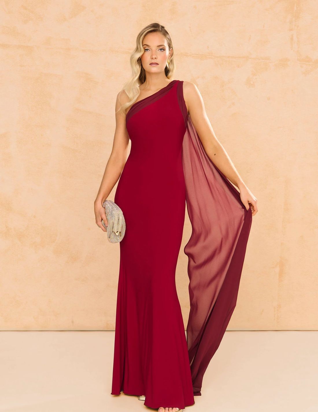 Elegance and sophistication come together in this spectacular terracotta crepe satin long dress, ideal for special events. Its flowing silhouette and impeccable drape enhance the figure, while the long cape adds a touch of drama and movement. With a refined design and satin finish, this dress is the perfect choice for those seeking distinction and style in one piece.