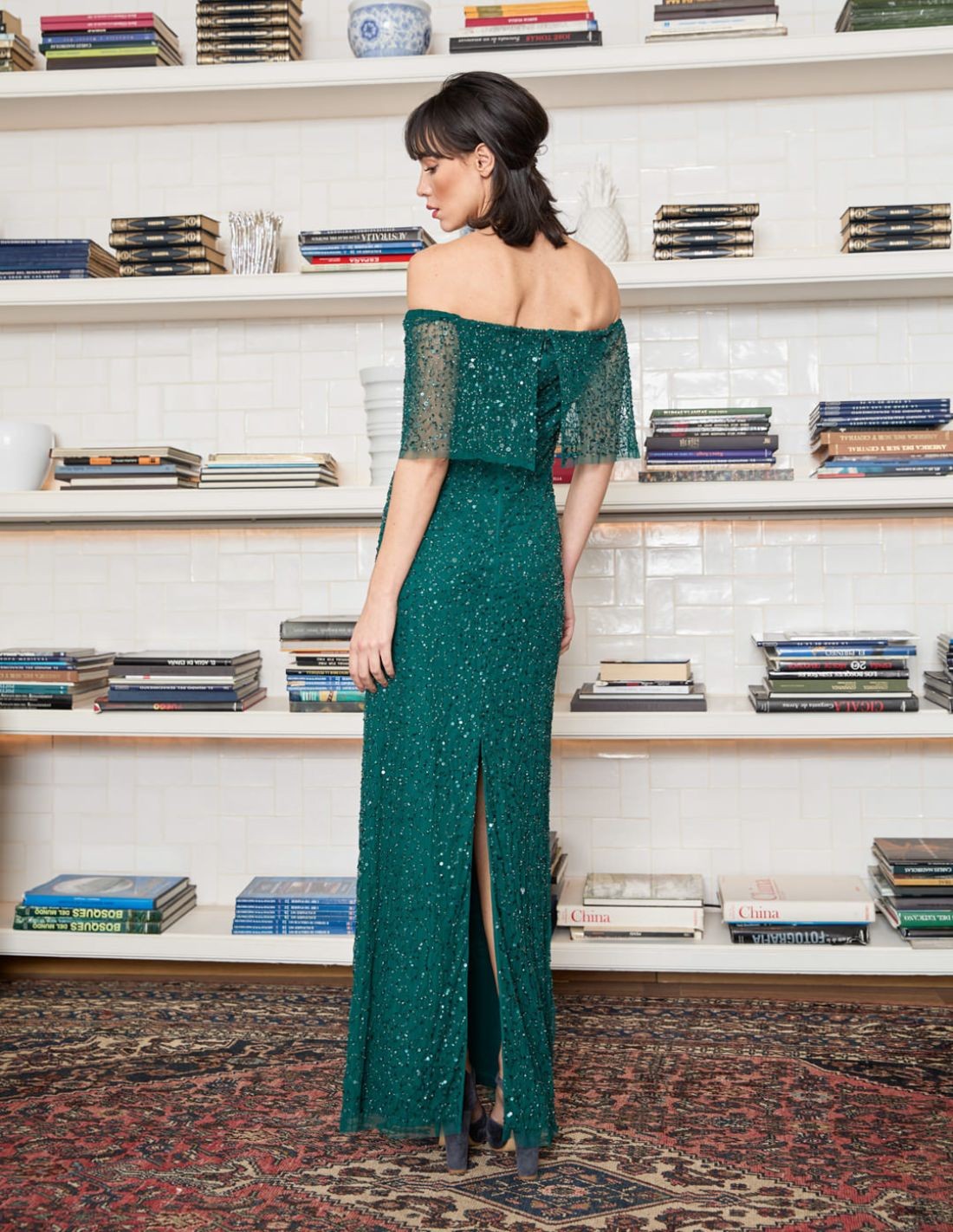 Long green party dress with bardot neckline and rhinestones