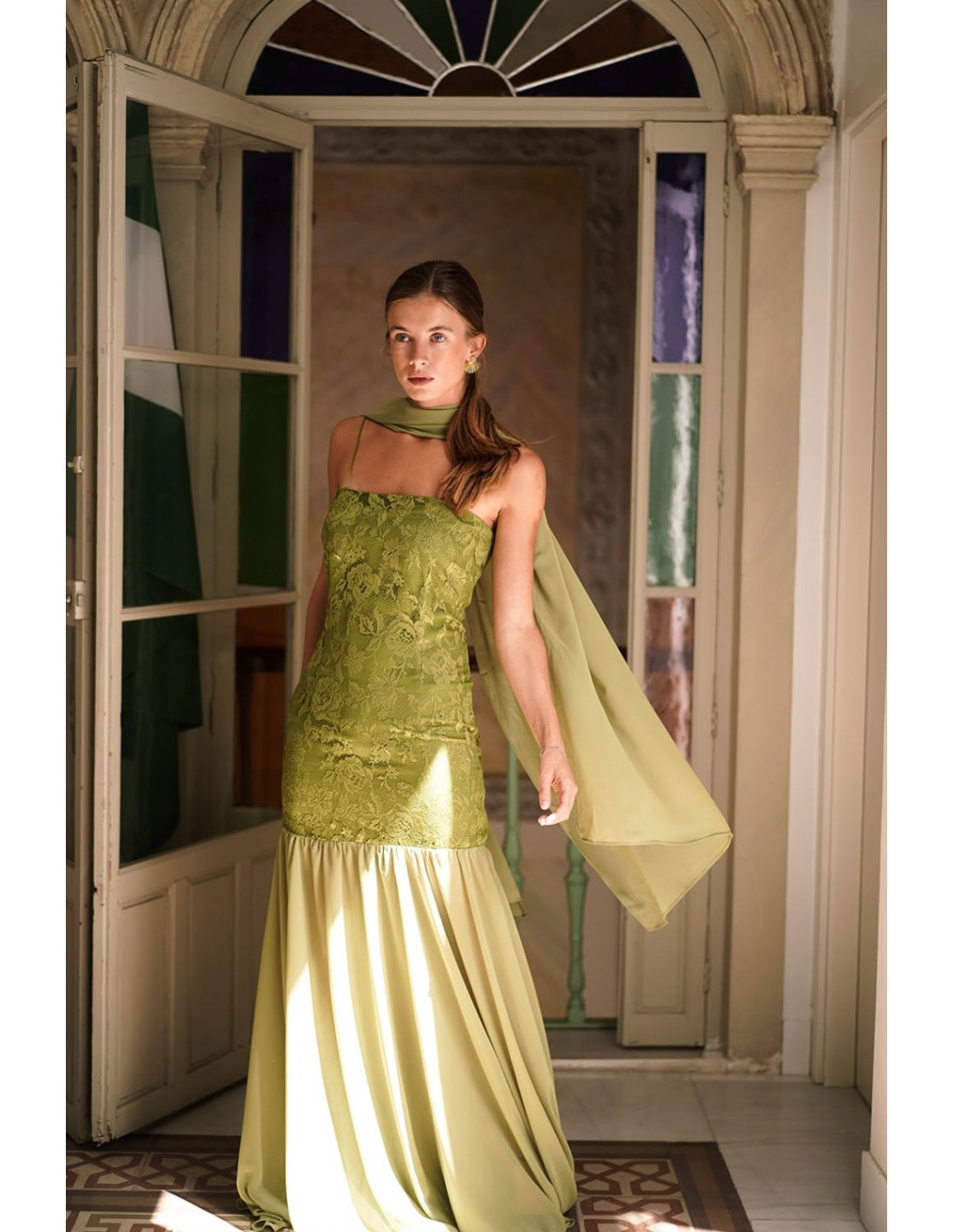 Dazzle with natural elegance thanks to this olive green lace long dress with chiffon skirt, a garment that balances romanticism and sophistication. The body, made of lace, enhances the silhouette with a delicate and feminine design. Its vaporous chiffon skirt provides movement, lightness and an ethereal effect when walking.
