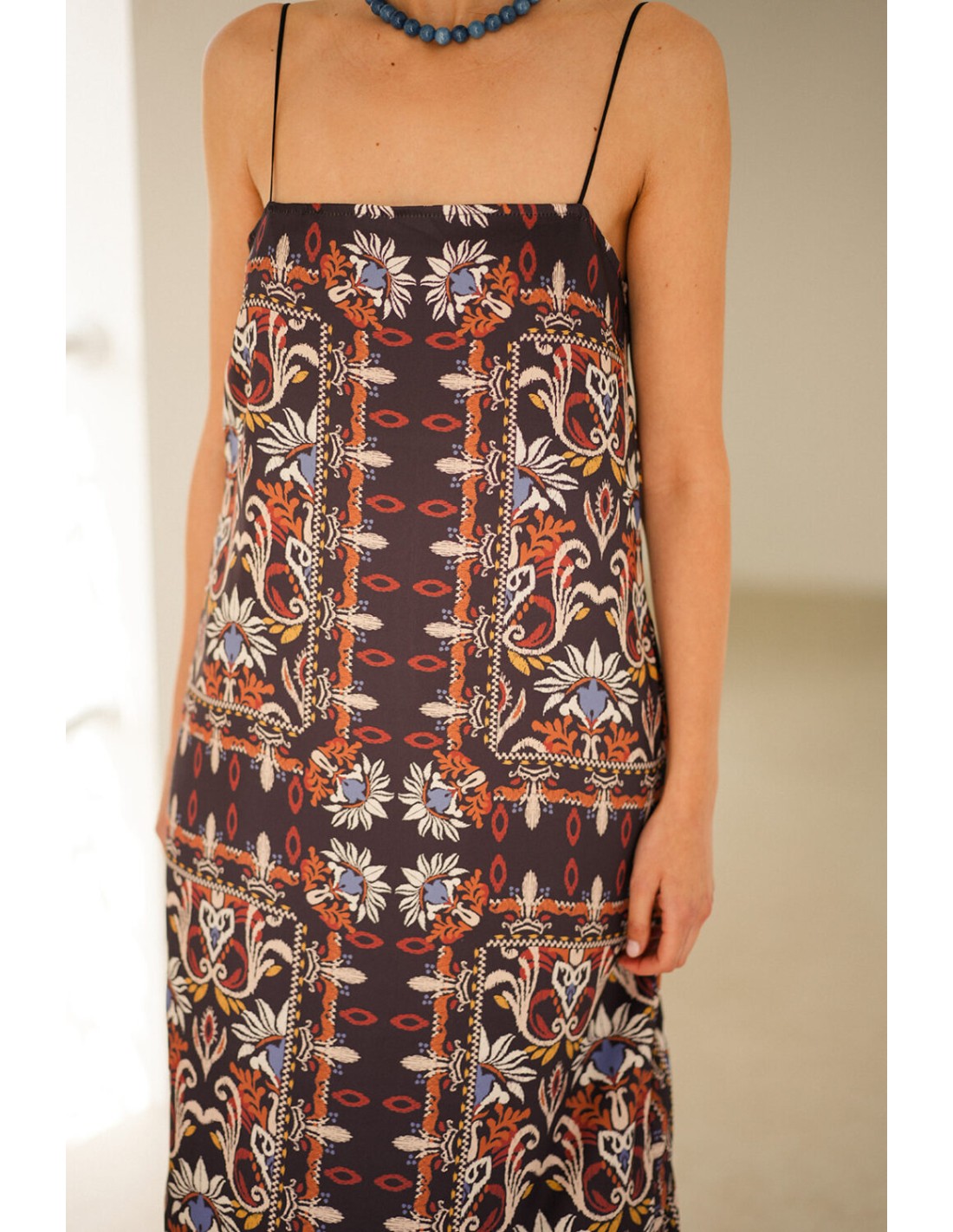 If you are one of those who bet on comfortable and fluid dresses, this long straight dress will be a sure hit. A dress in fabric with ethnic print, with a long and straight design with thin straps and fluid fall that allows you to move easily. A versatile garment, both for events and for a more informal occasion combining it with sandals.