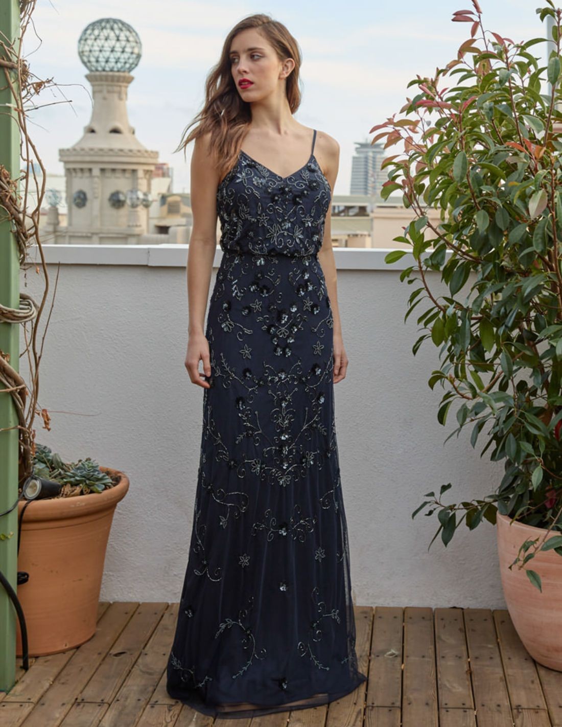 This long party dress is a real gem for your most special events. Made in a delicate fabric with floral embroidery and sequin details, it brings a subtle and elegant shine that will make you stand out. Its design with V-neckline, thin straps and flowing drape naturally slims the figure.