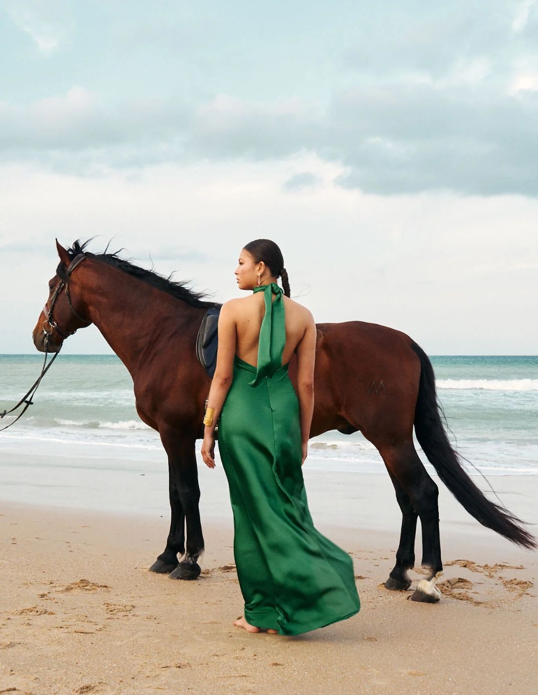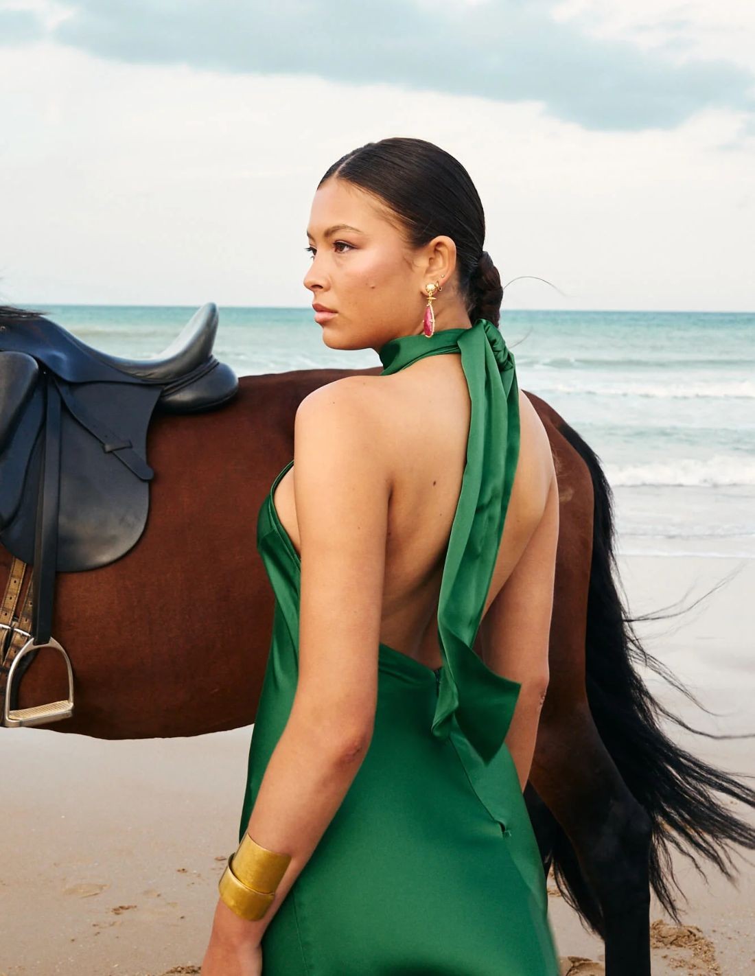 If you like bright colors and you still don't have a look for your next event, this long satin party dress is perfect. A long satin fabric dress in green color, with halter neck and open back, fitted silhouette and bias cut. Ideal for a summer event, whether it is a wedding or even a graduation.