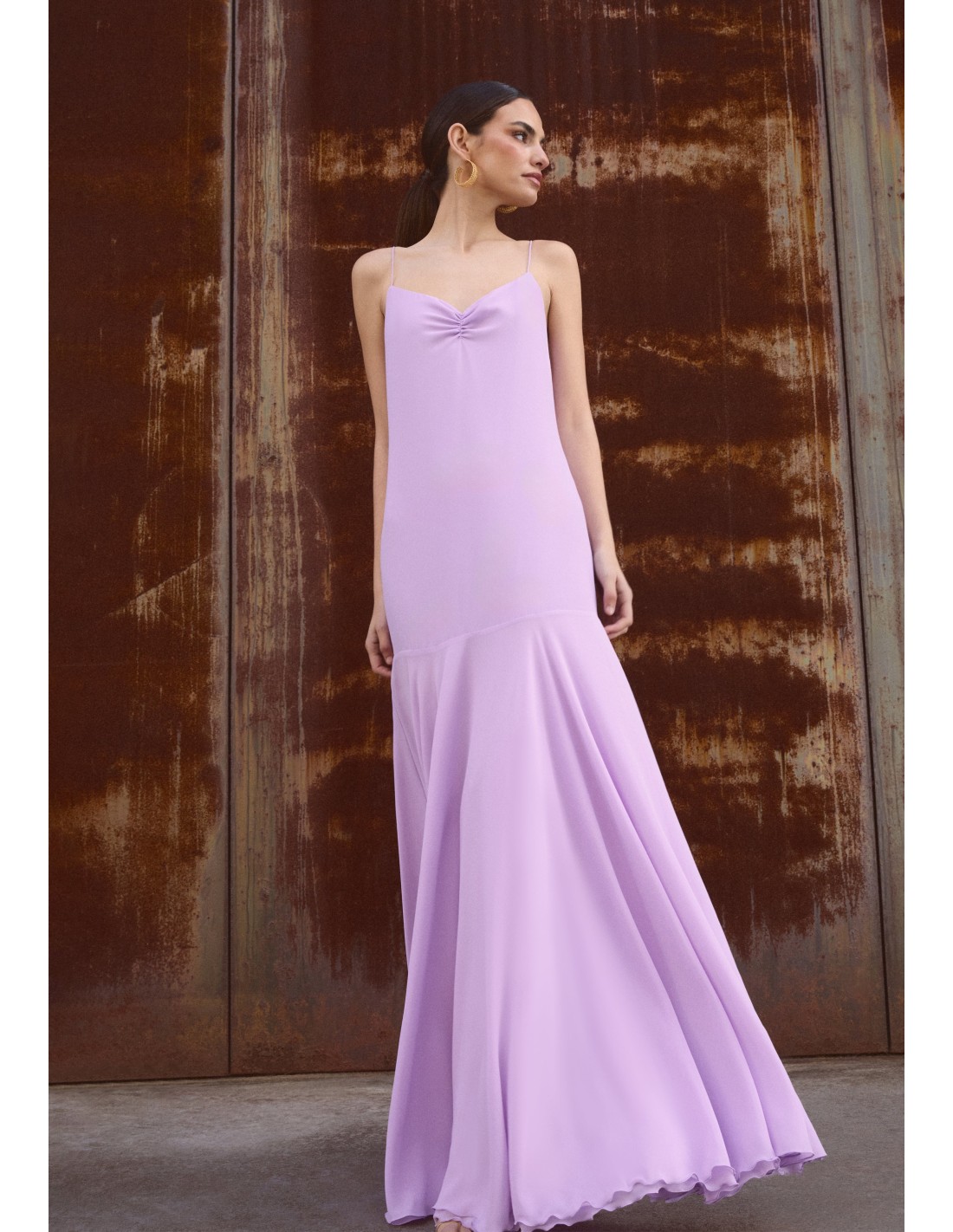 This long lilac wedding guest dress is made of soft georgette fabric that stands out for its romantic and flowing design. The strapless bodice features a delicate gathering at the center front that enhances the V-neckline, adding a subtle and feminine touch.