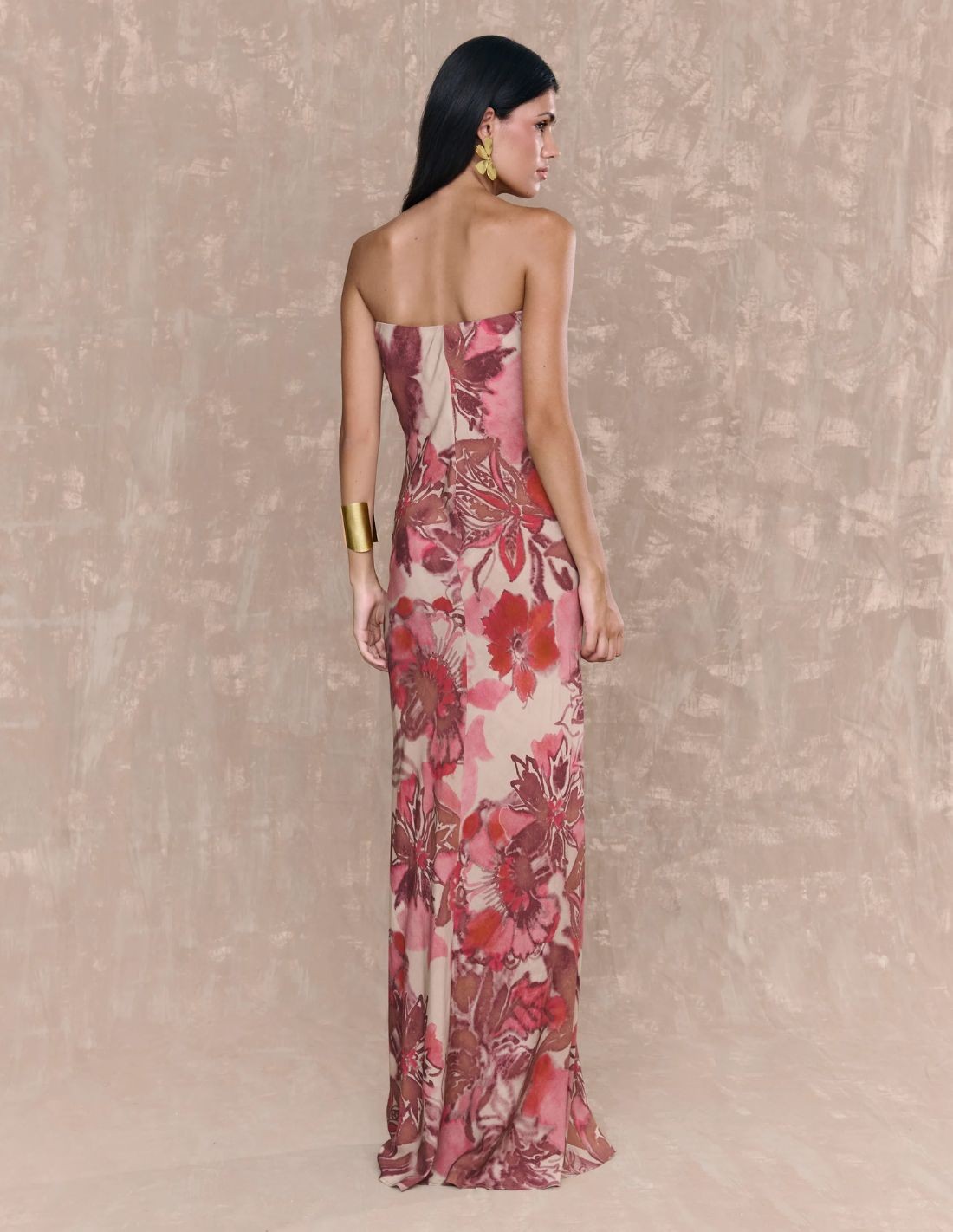 If you have an evening event, you are a bridesmaid or you have your graduation, this long guest dress will become your ally. Made in high quality viscose, with a print in pink, maroon and cream tones. It incorporates strapless neckline and flared cut allowing a perfect fit and figure. You can combine it with the matching shawl to create the perfect look for your next special occasion.