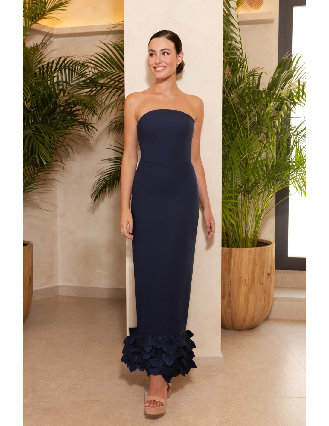 The midi dress with strapless neckline and floral detail at the hem is an elegant and feminine option for special occasions. Made in crepe and chiffon, it combines the sophisticated structure of crepe with the light fluidity of chiffon, achieving a refined finish full of movement. The strapless neckline enhances shoulders and neck with a sensual and timeless air, while the layer of chiffon at the bottom, adorned with a delicate floral detail, brings originality and romanticism.