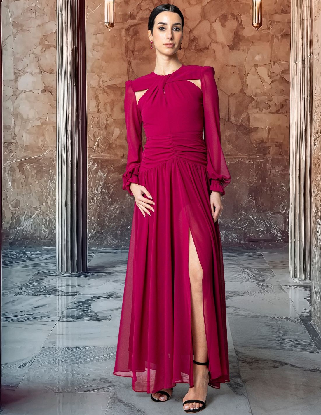 This long chiffon dress combines elegance and sensuality with a fluid and modern design. Its bodice features delicate sidecut-outs that enhance the silhouette in a subtle and sophisticated way. The long puffed sleeves add volume and movement, while the A-line skirt with front slit offers a flowing and feminine effect.