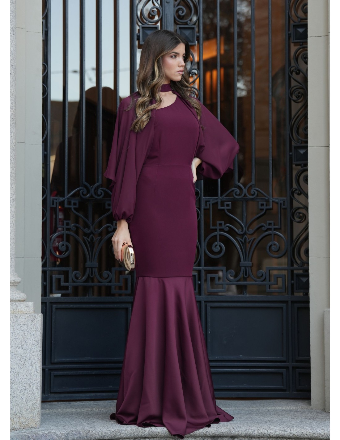 Long burgundy mermaid cut dress with asymmetrical neckline and cape