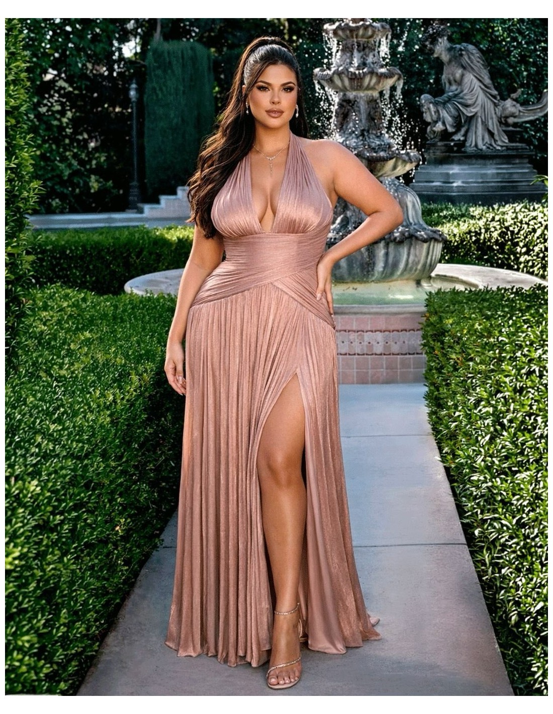 This long guest dress is a piece designed to shine with elegance in the most special events. Crafted in pleated chiffon with a delicate metallic sheen, its light and airy fabric creates a sophisticated effect. The plunging neckline enhances the neckline, while the pleated bodice fits delicately to the body, defining the silhouette in a flattering way. The high waistline slims the figure and gives way to a flowing skirt with a slit, which adds dynamism without losing elegance. Ideal for evening weddings, galas or special events.
