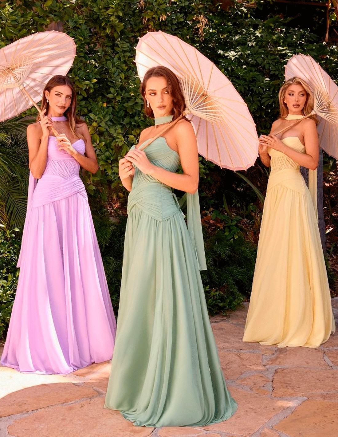 The long, flowing chiffon skirt creates a light and sophisticated movement, ideal for daytime weddings, garden celebrations or spring events. Includes a matching chiffon shawl, perfect for completing the look and adding versatility for both style and comfort.