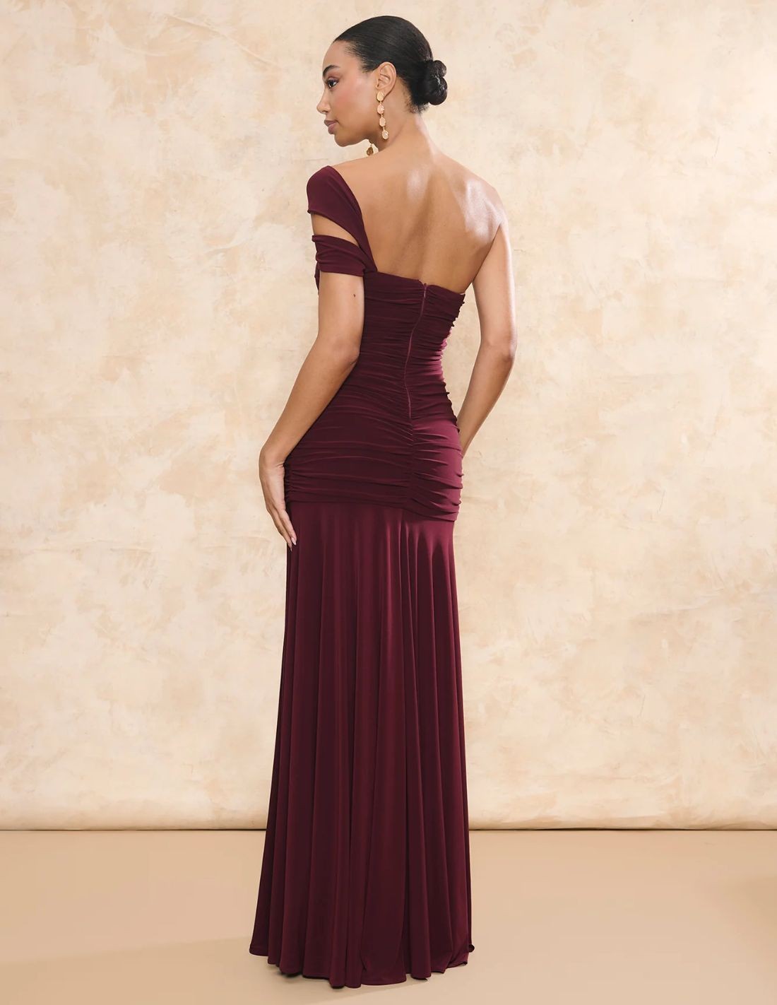 Maroon long guest dress with asymmetrical neckline and long cape cut