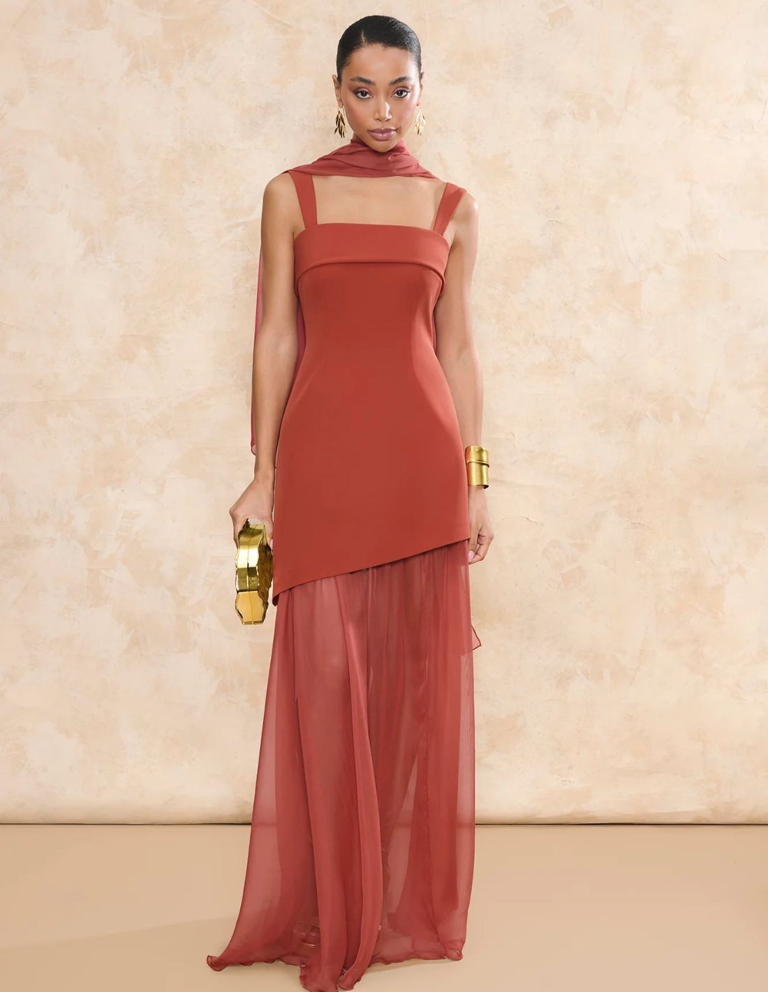 Terracotta long guest dress with asymmetric skirt and chiffon