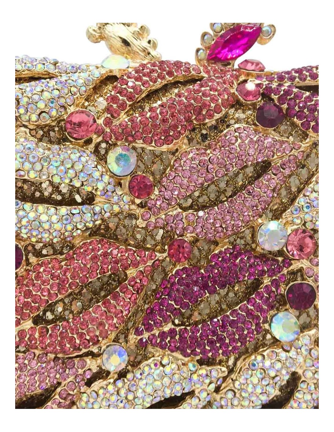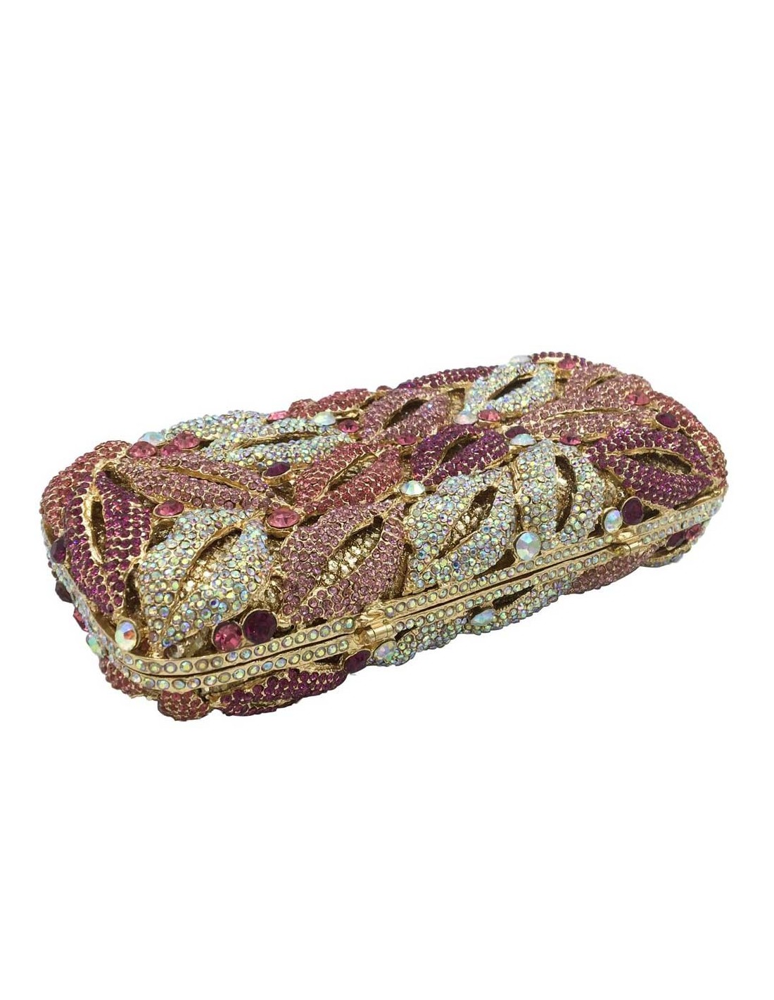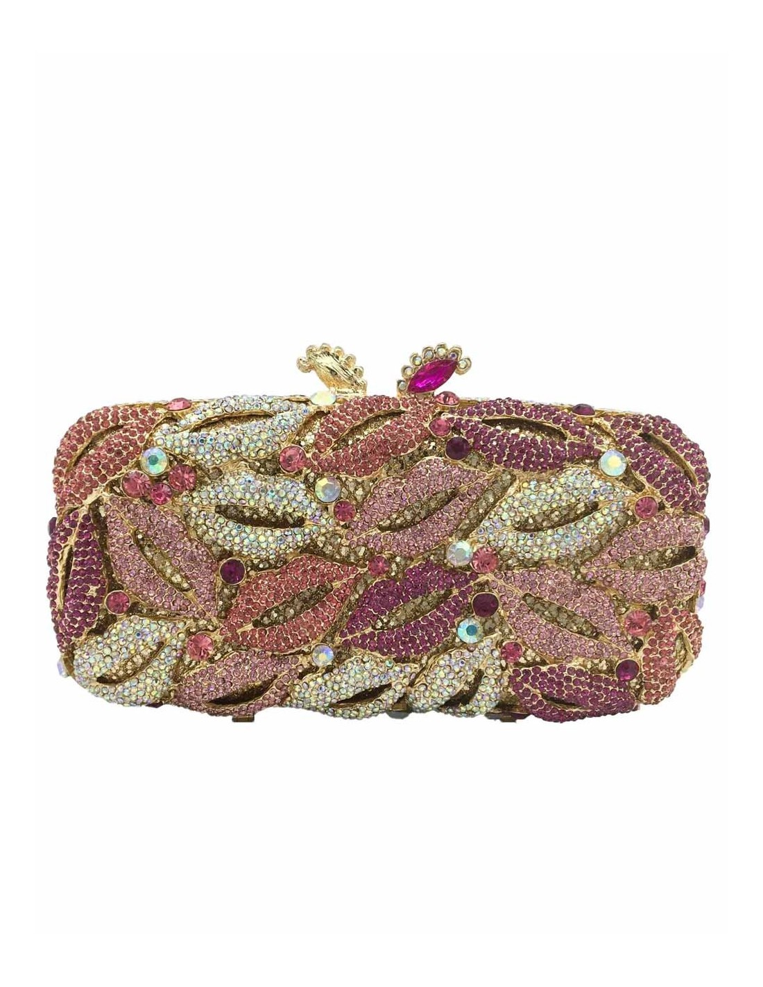 Jeweled clutch bag made of metal with small crystals forming kisses in different shades of pink and white.