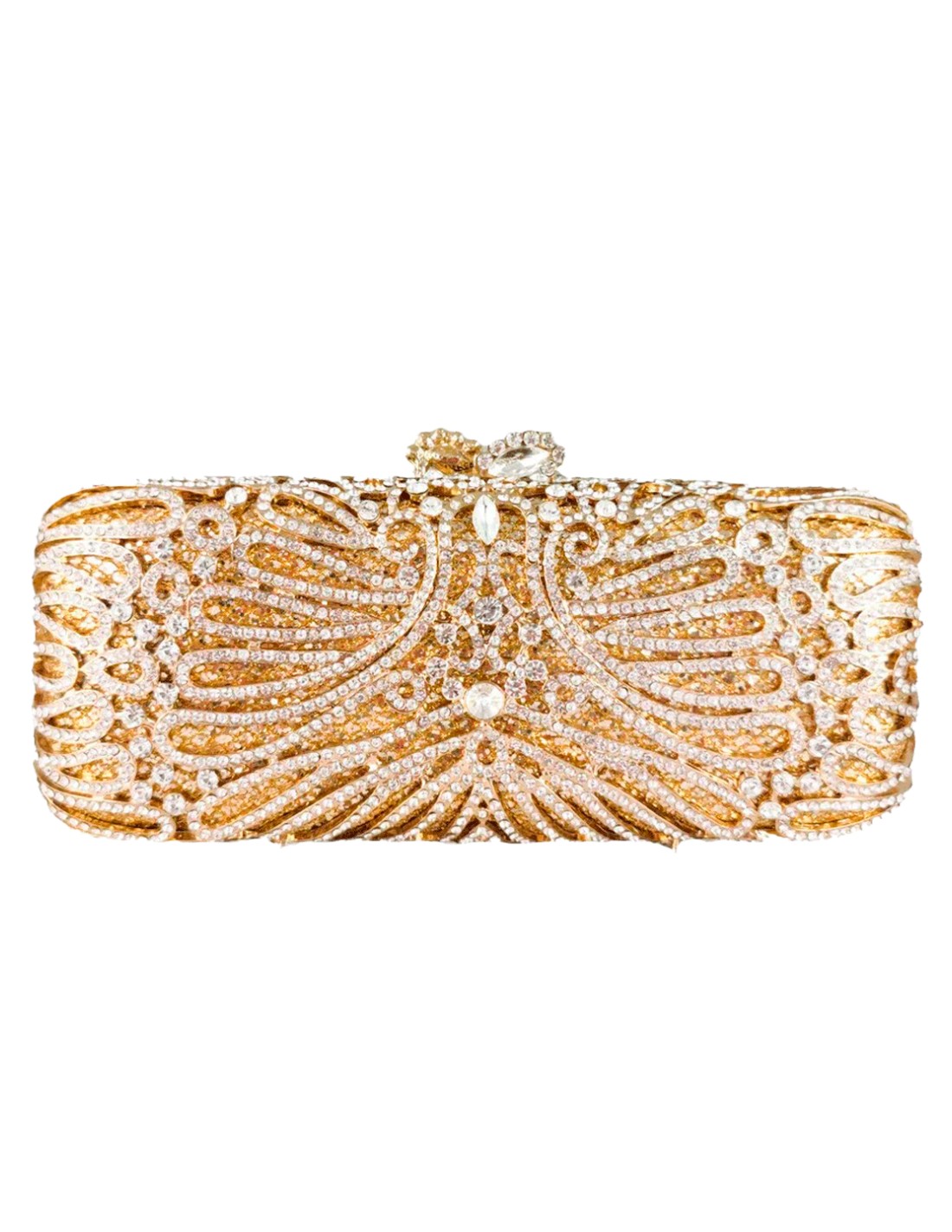 Jewel clutch bag with crystals on a golden elongated base