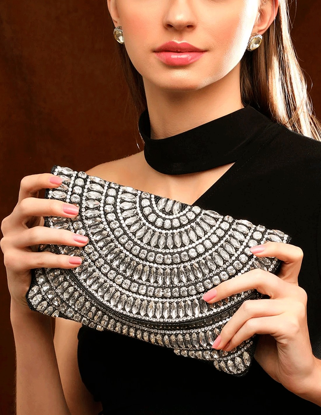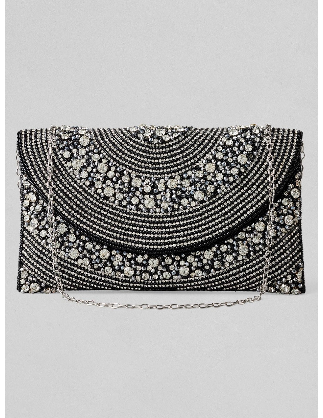 Black evening clutch bag with white crystals