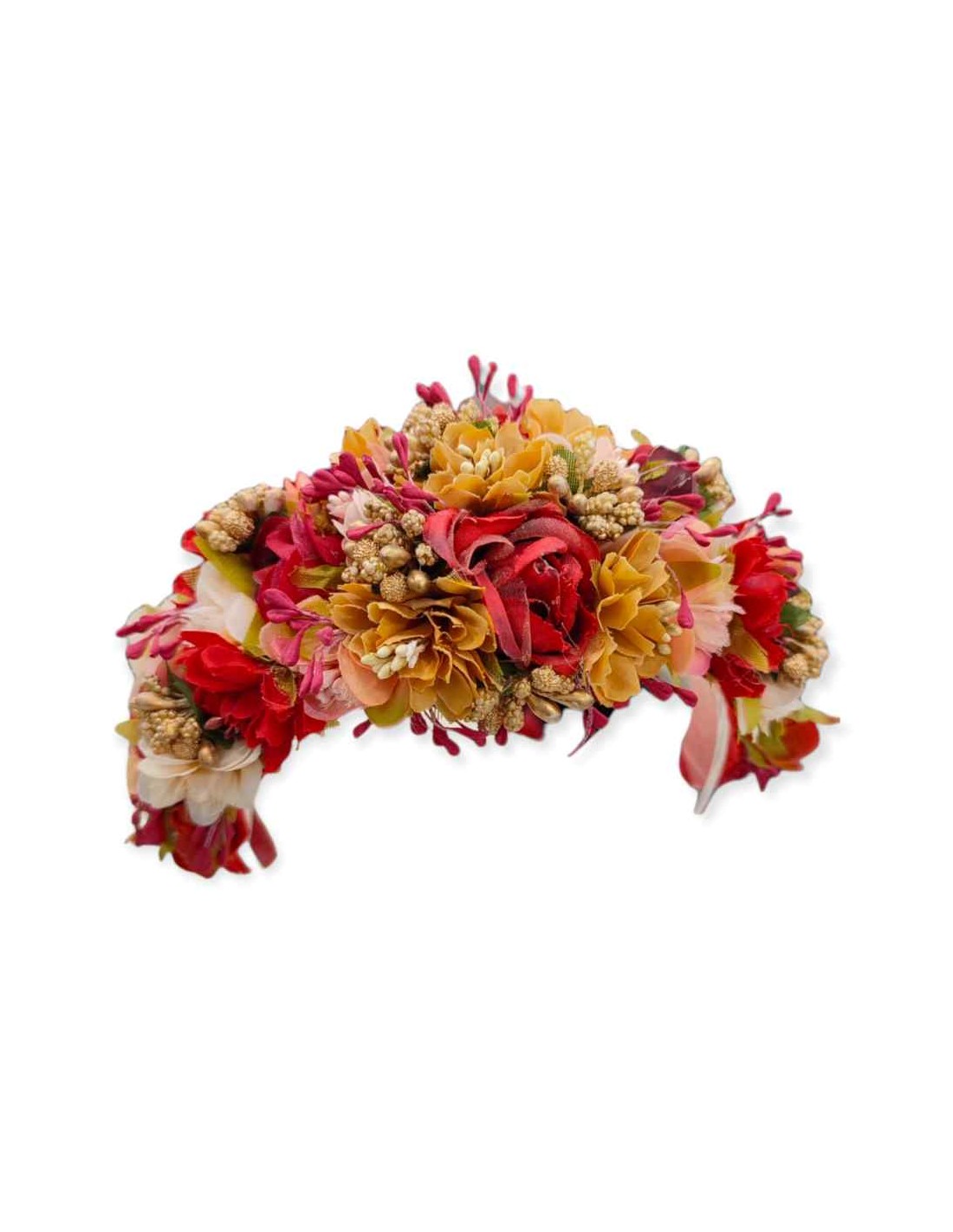 Diadema de flores para invitada en tonos rojos