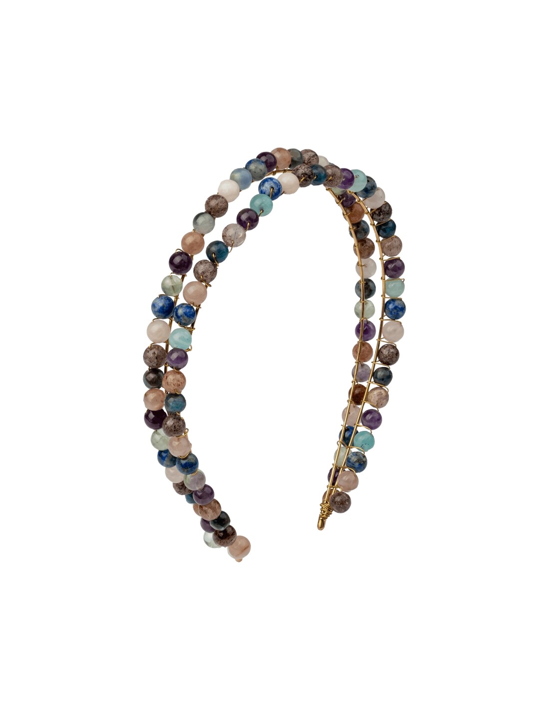 The Olivenza multicolor headband is an exclusive accessory that combines natural stones in blue and mauve tones, creating a piece full of sophistication and style. Designed for the most special occasions, this headband stands out for its elegance and comfort.
