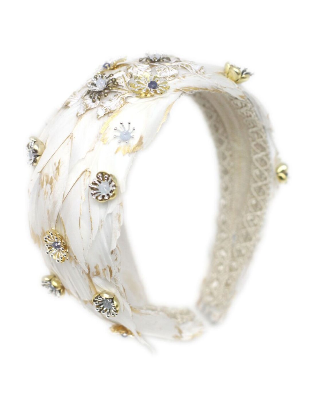 Elegant and luminous, this white feather guest headband is a delicate piece that adds sophistication and a touch of jewelry to any ceremony look. Made with feathers in white tones, it stands out for its light texture and finish, ideal for weddings and special events. The design is enriched with a jeweled decoration, which combines details in gold and silver tones, providing subtle shine and a refined air. Its balanced volume enhances the hairstyle with elegance, both in updos and half updos. This headband is designed and handcrafted in Spain.